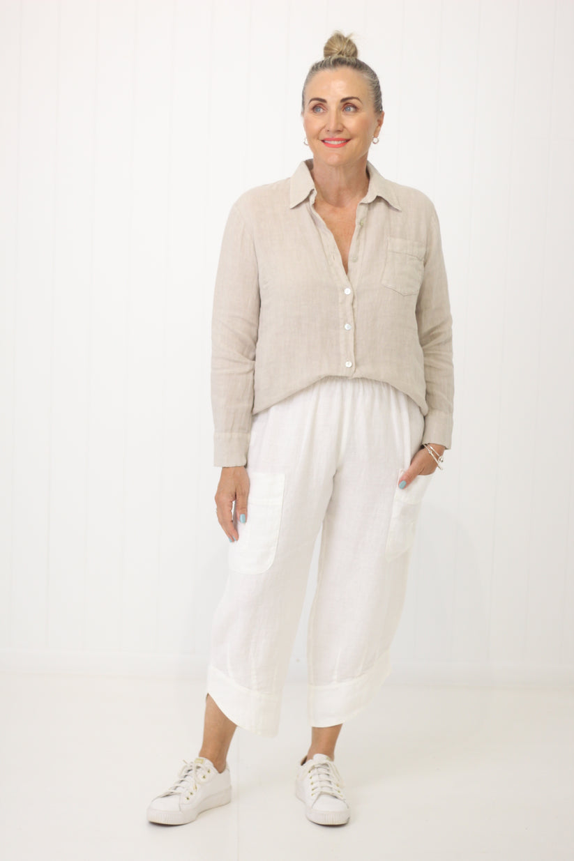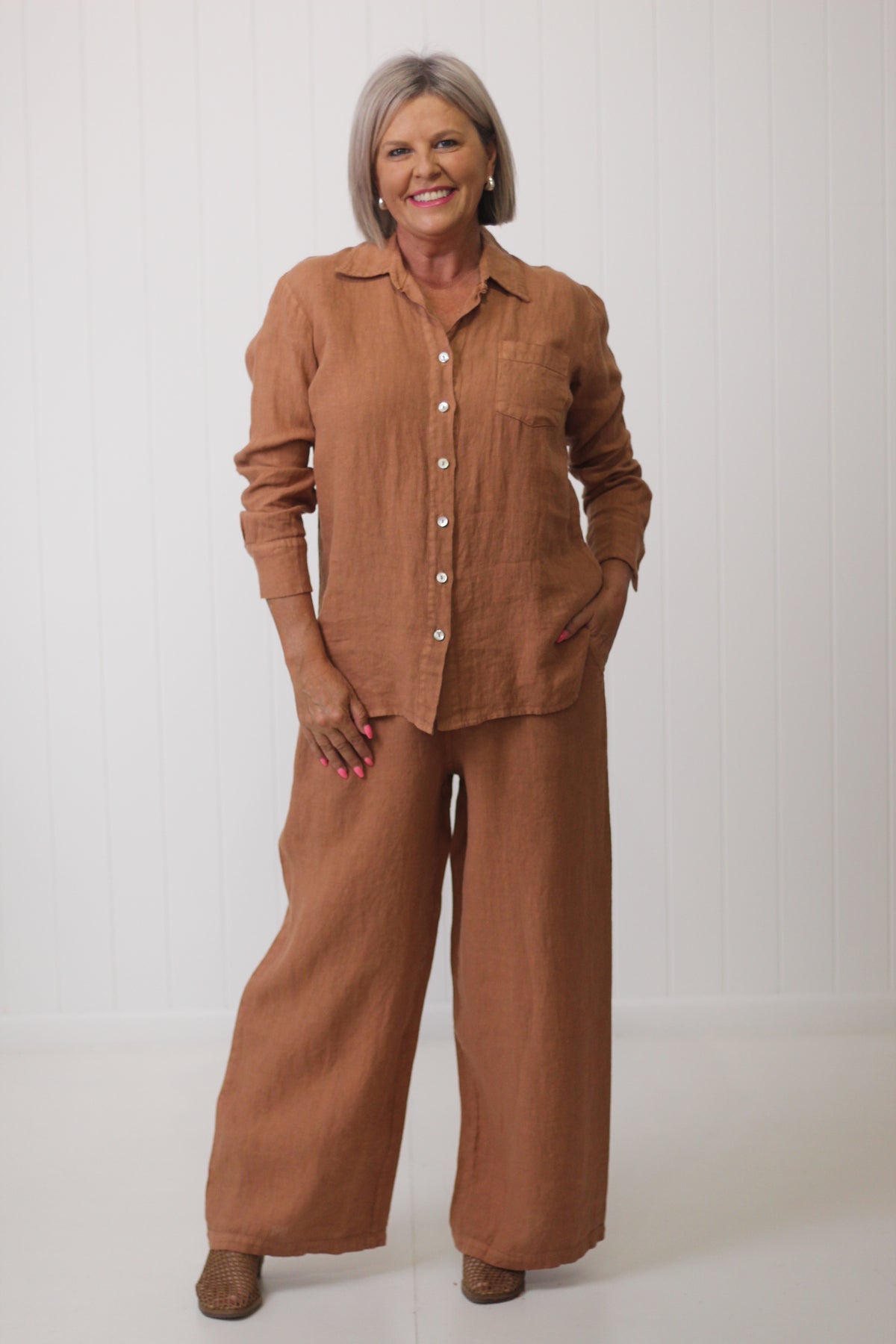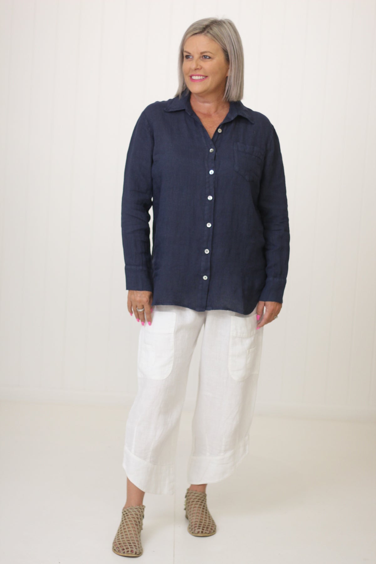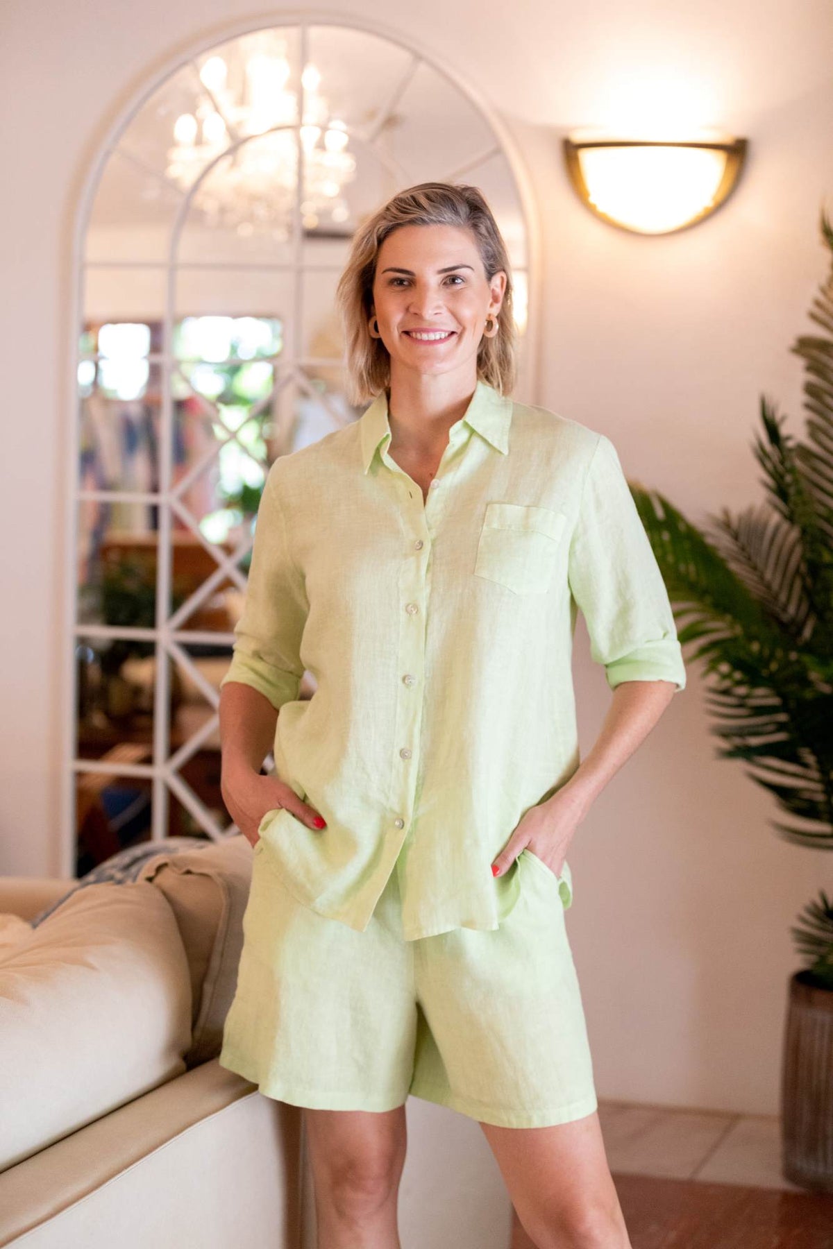 The Blair Top is a wardrobe staple that can be worn all year round. Made with soft Italian linen, this classic button down shirt features a full length sleeve that can be rolled up for a more casual look. Completed with a breast pocket for additional detail. This top is a timeless and versatile addition to any wardrobe. Available in a number of beautiful colours. May also be worn as a light jacket over a cami or tee, mix it up! Upsize for that baggy look that's in this season.