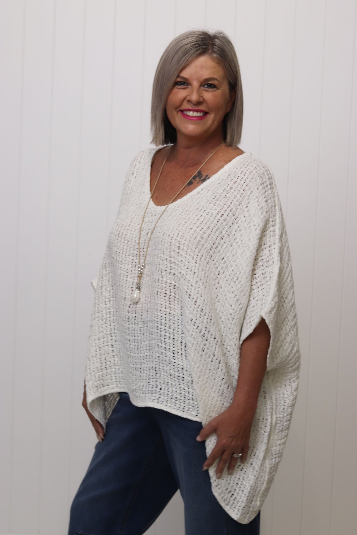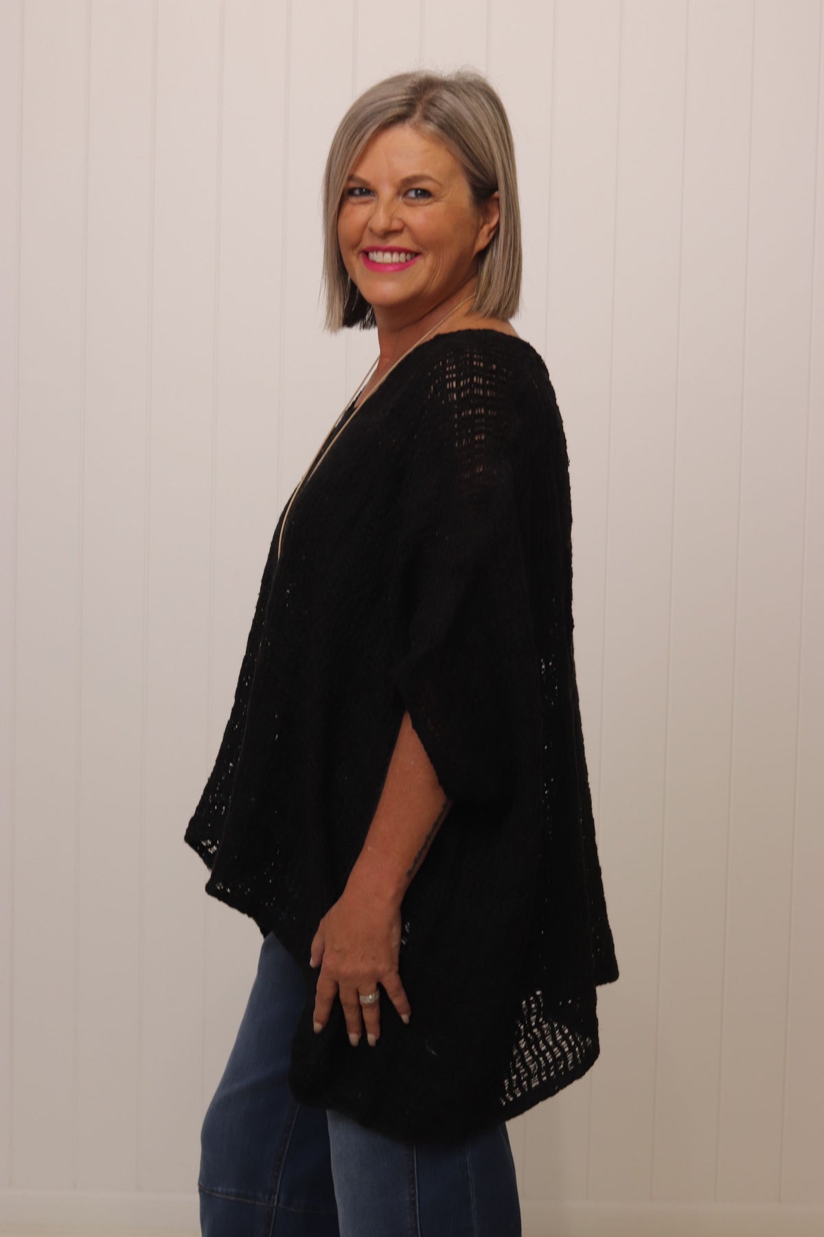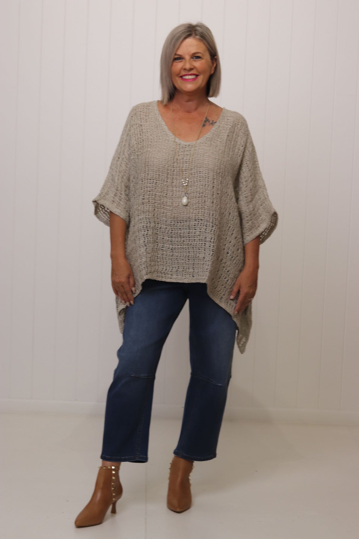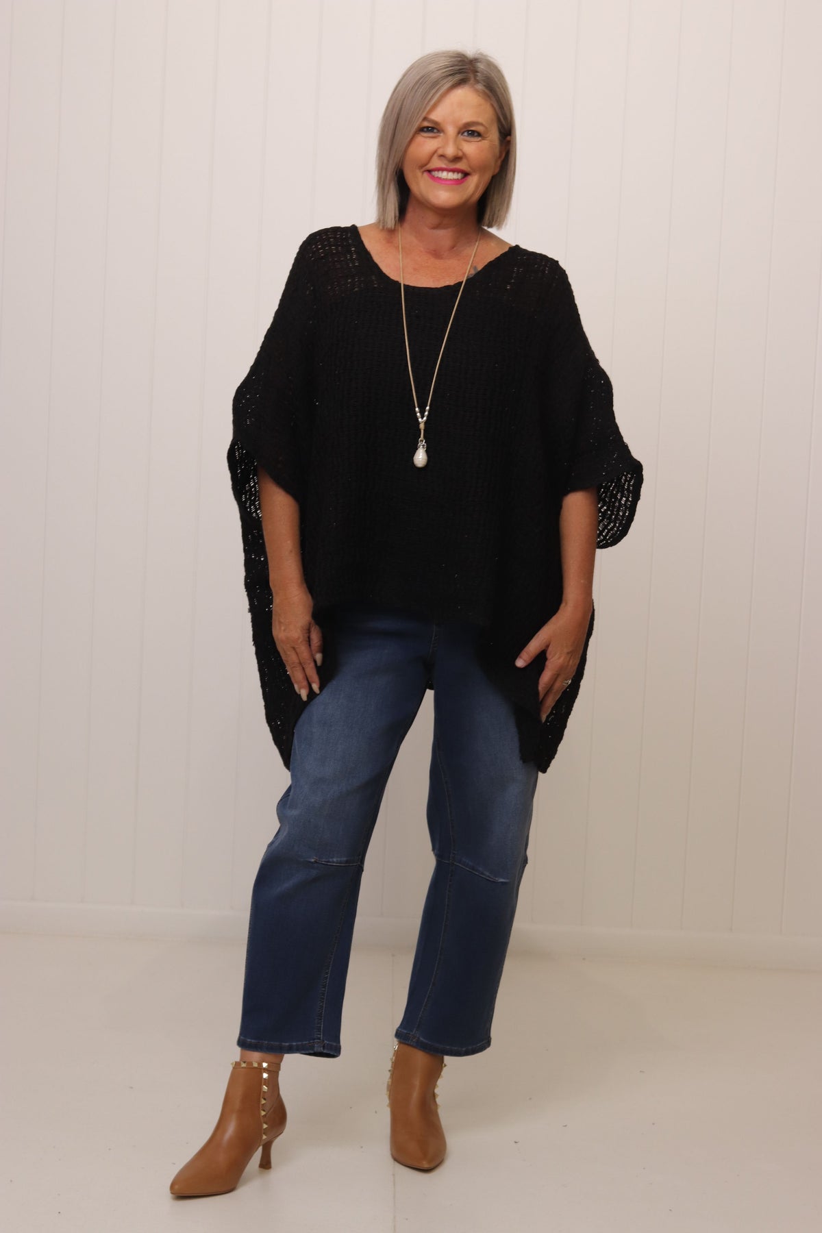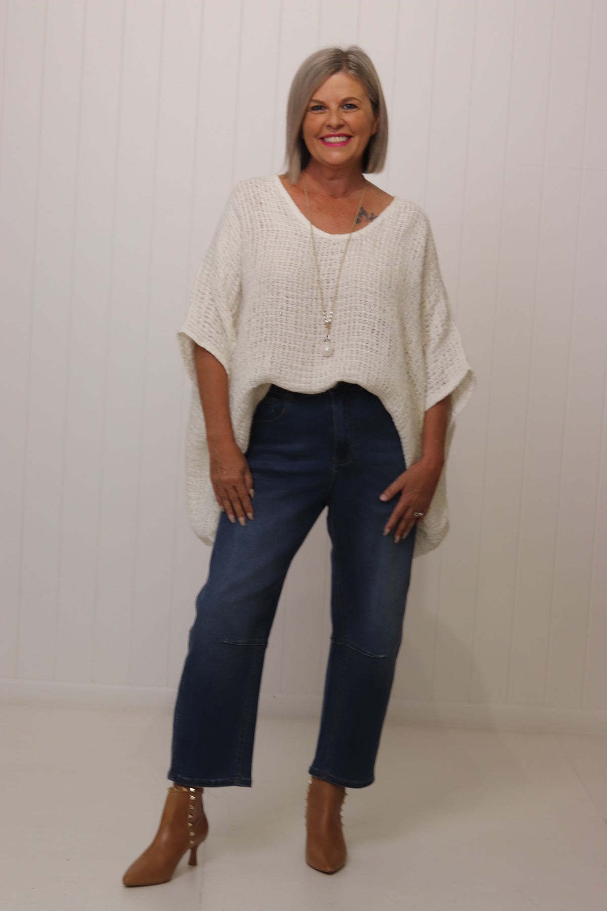 Kay is a size 10. Kay has styled the Carlos Top with our Toni Barrel Jean and the Charlotte Stud Booties.