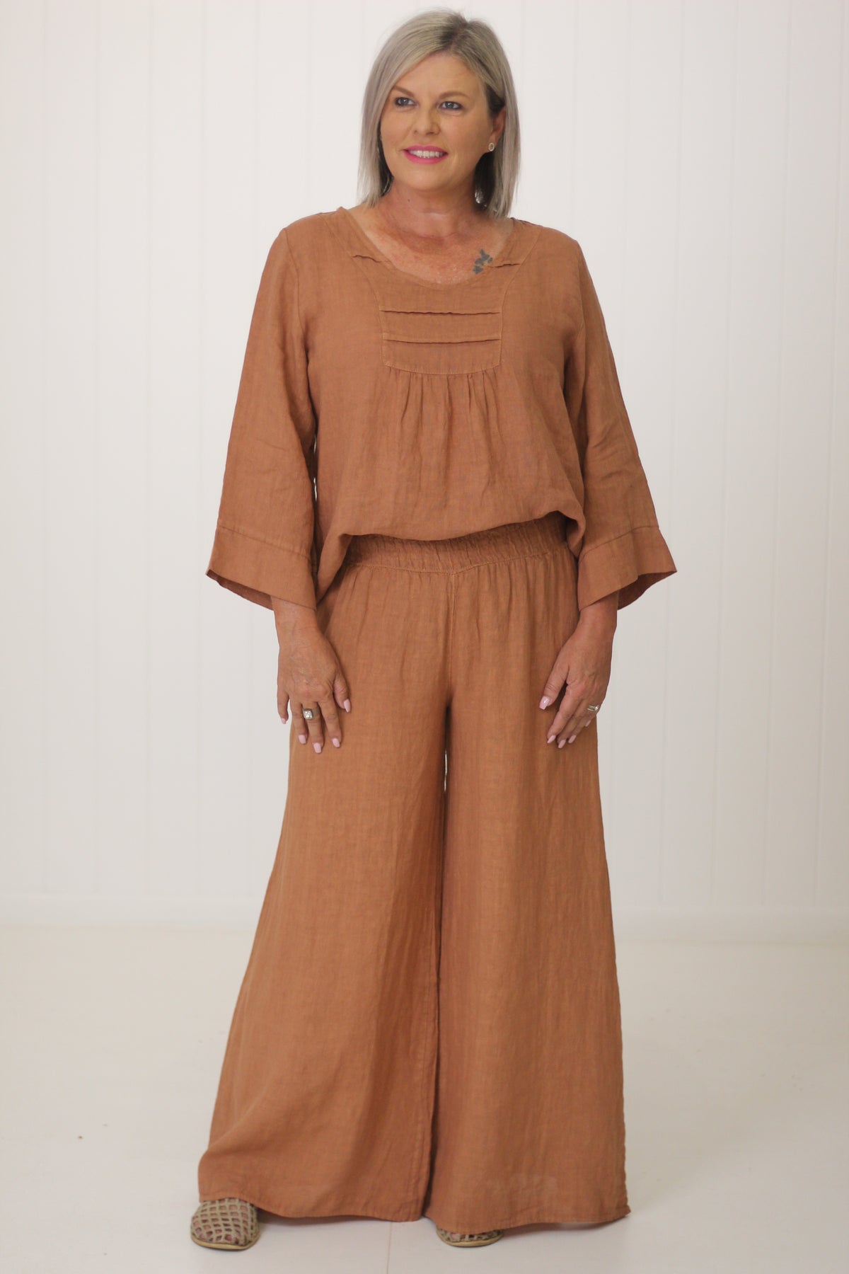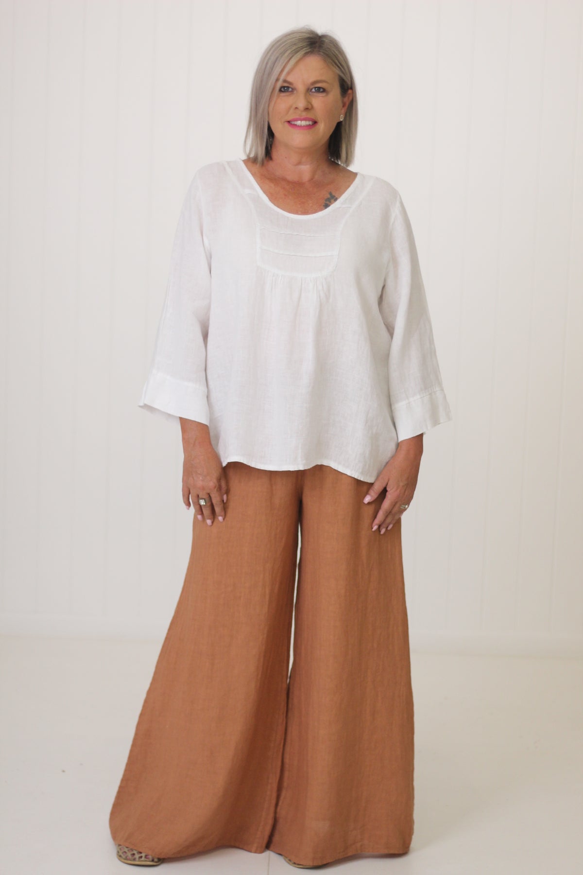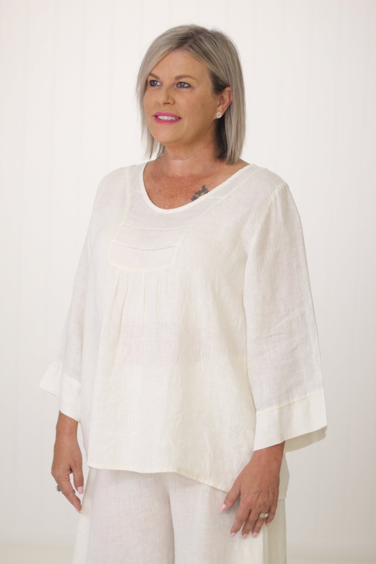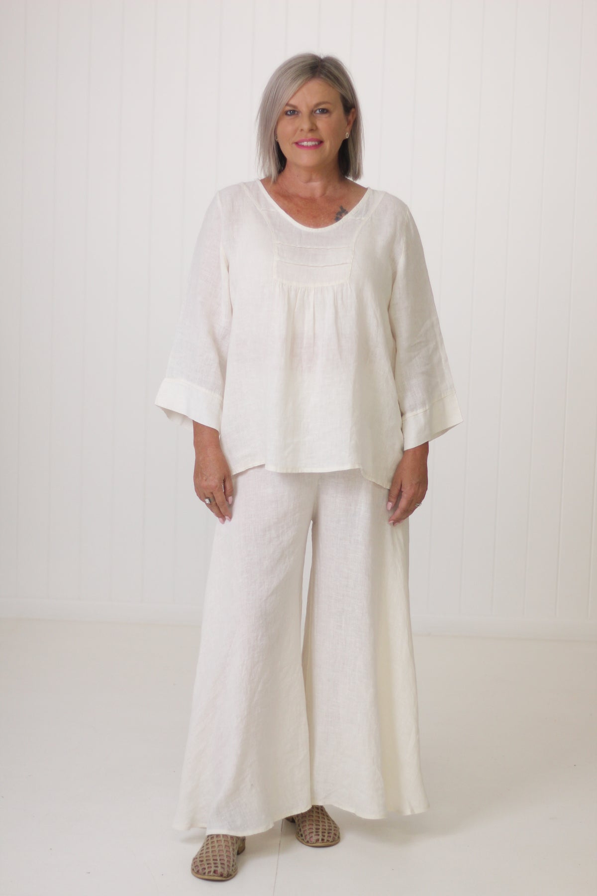 The timeless charm of the Lucia Top, designed for both comfort and style, this beautifully designed top features a flattering scoop neckline and full-length sleeves. The soft, breathable linen drapes beautifully, while the feature pleat and gathered bodice add a touch of elegance.