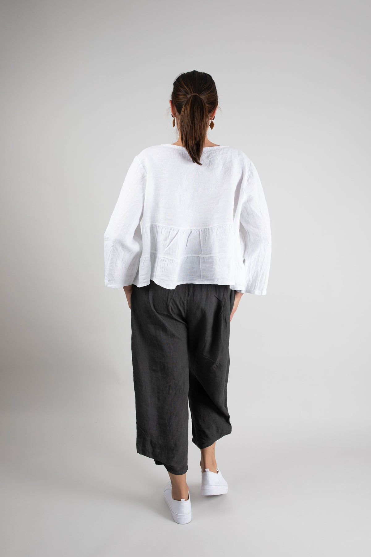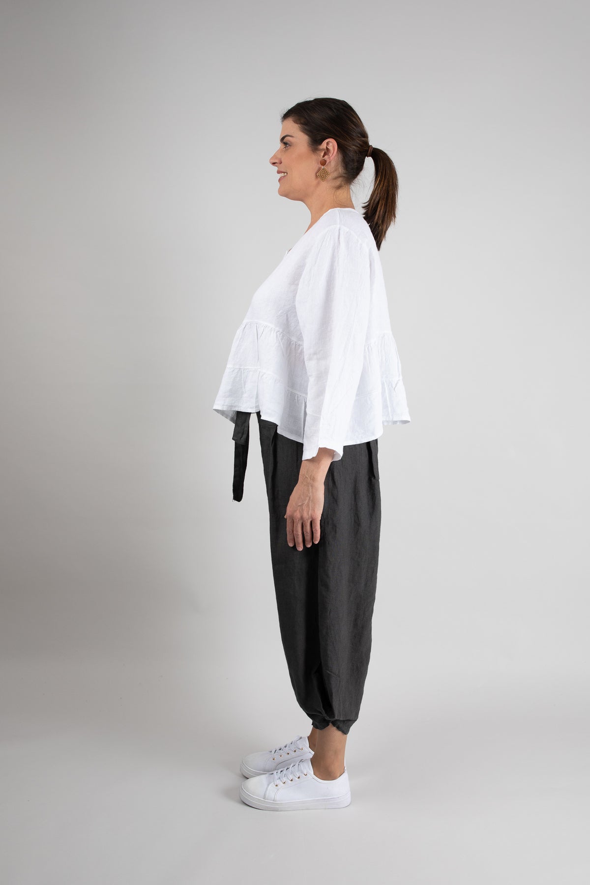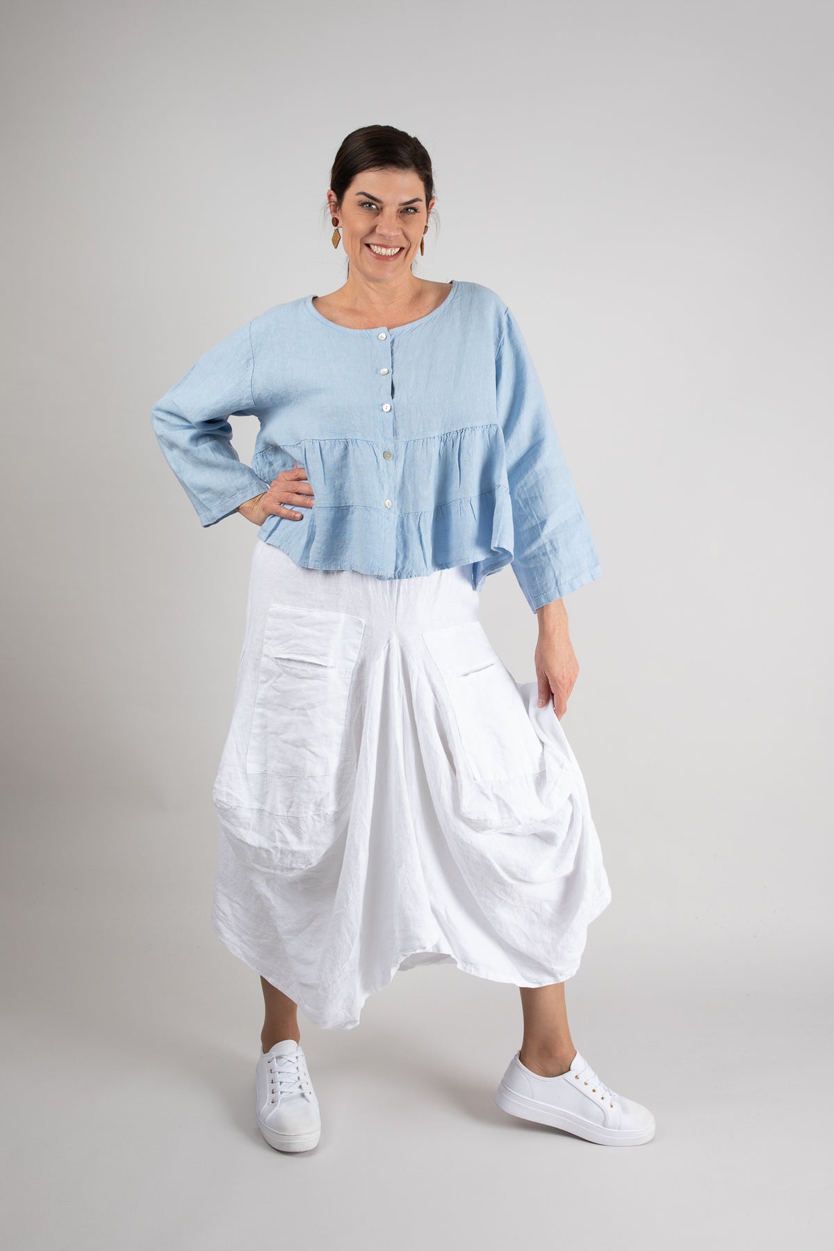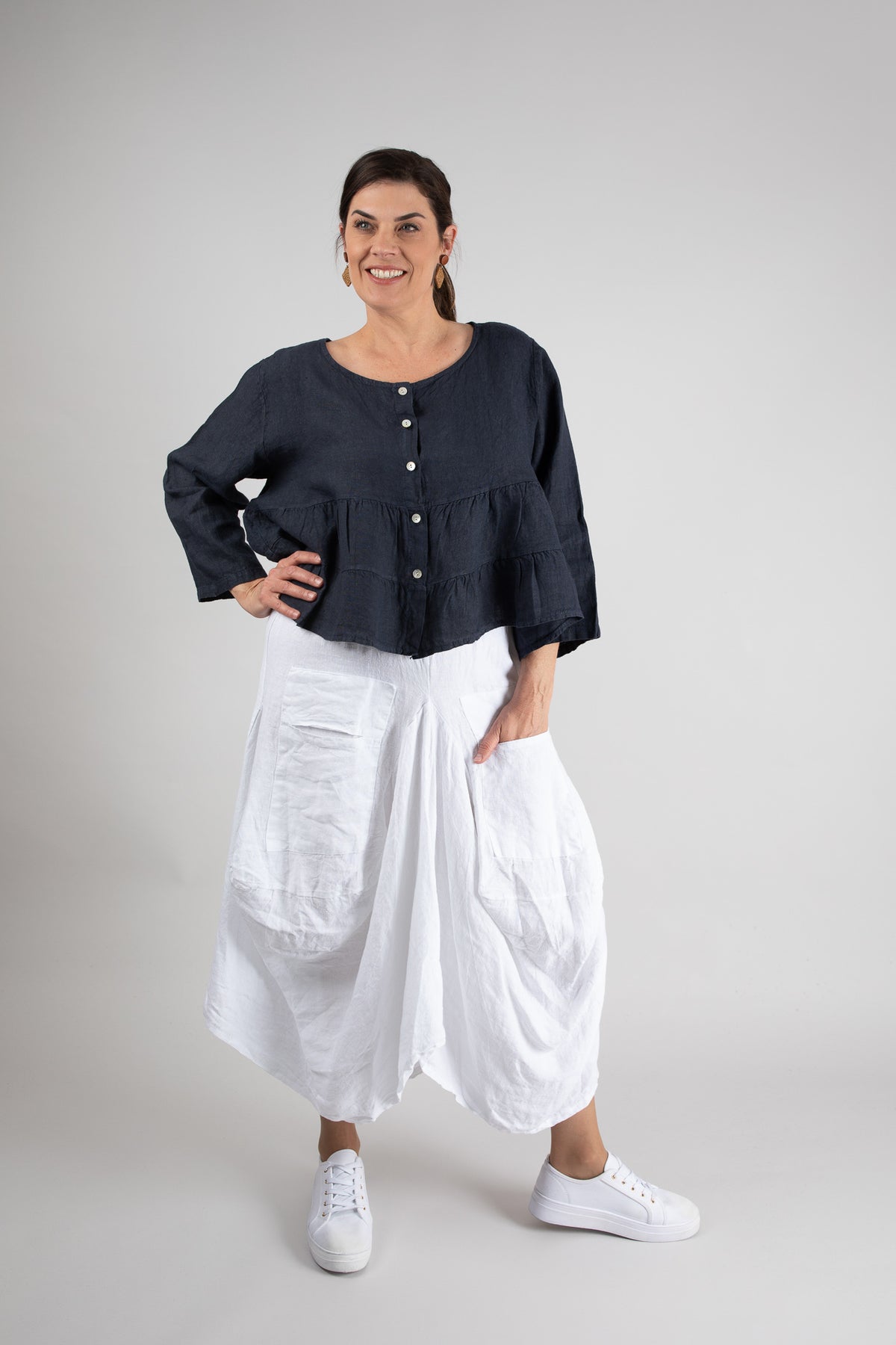 Our beautiful Mia waist-length Italian linen jacket has a full buttoned front and long sleeves with a gorgeous floating frill along the bottom.