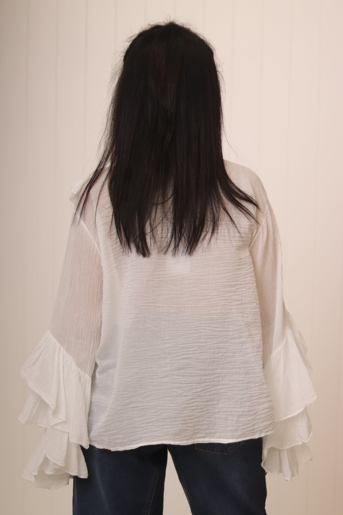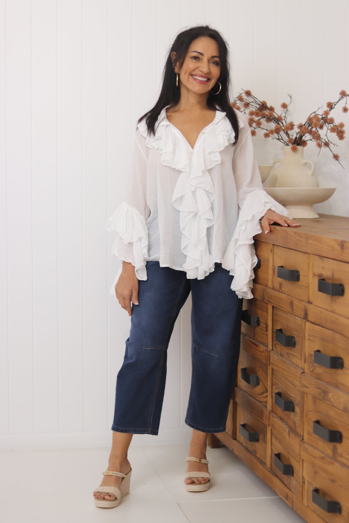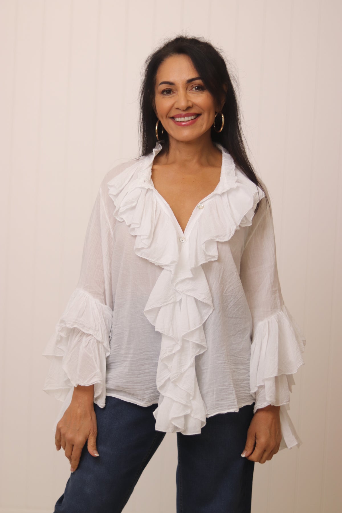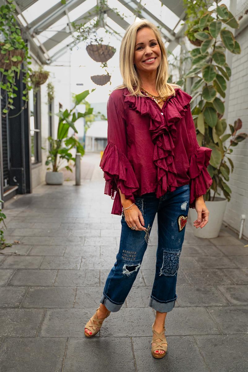 The Moselle Top features delicate feminine ruffles on the front and sleeves, complemented by a classic button-front design.