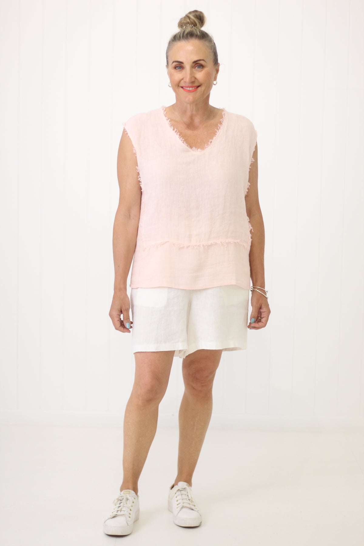 With a sweet frayed feature to the neckline, sleeves, and midline hem, its cool, breezy design pairs beautifully with our pants, skirts, shorts for an effortless, relaxed look.