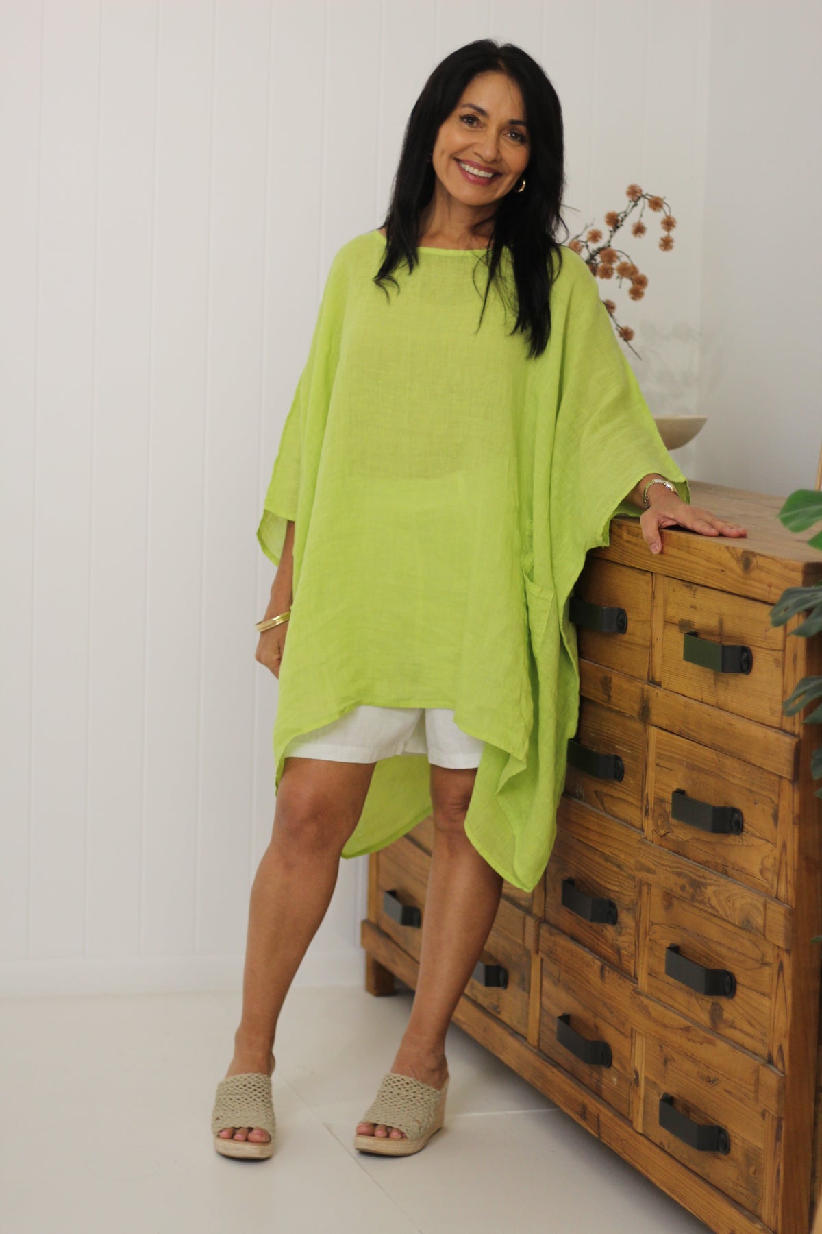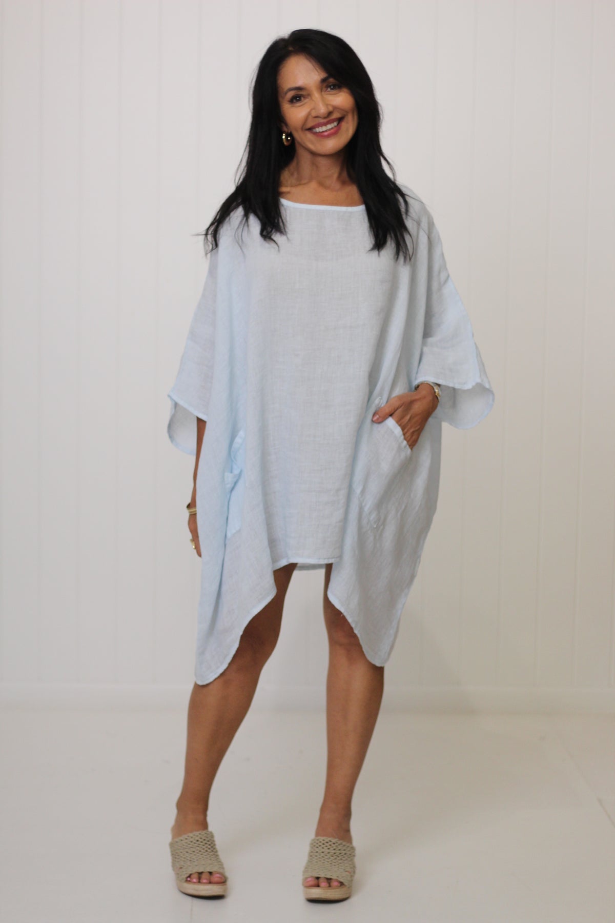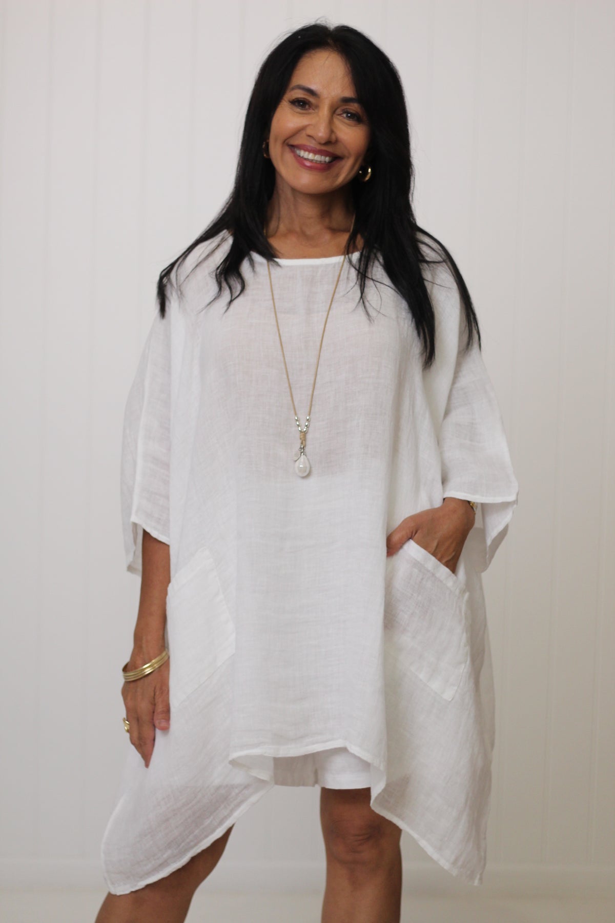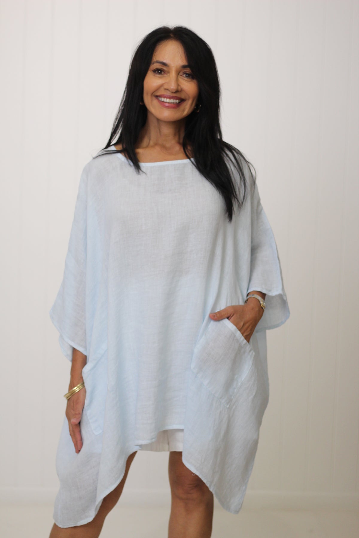 The Sardinia Top is an essential style for our customers who love to layer! Divine soft linen falls beautifully with the front pockets adding to the drape effect.