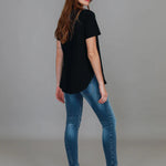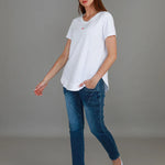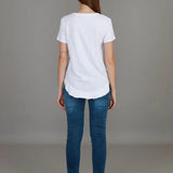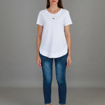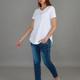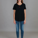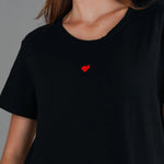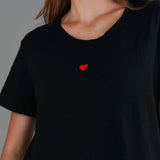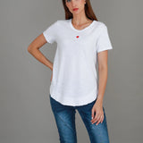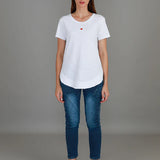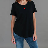 The Amelie Mini Heart Embroidery T Shirt features a delicate, mini embroidered heart on the front that adds a touch of sweetness to any outfit. Made of soft cotton, this short sleeve shirt also boasts a curve raw edged hem for a stylish, modern look.