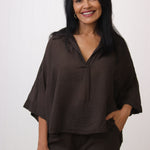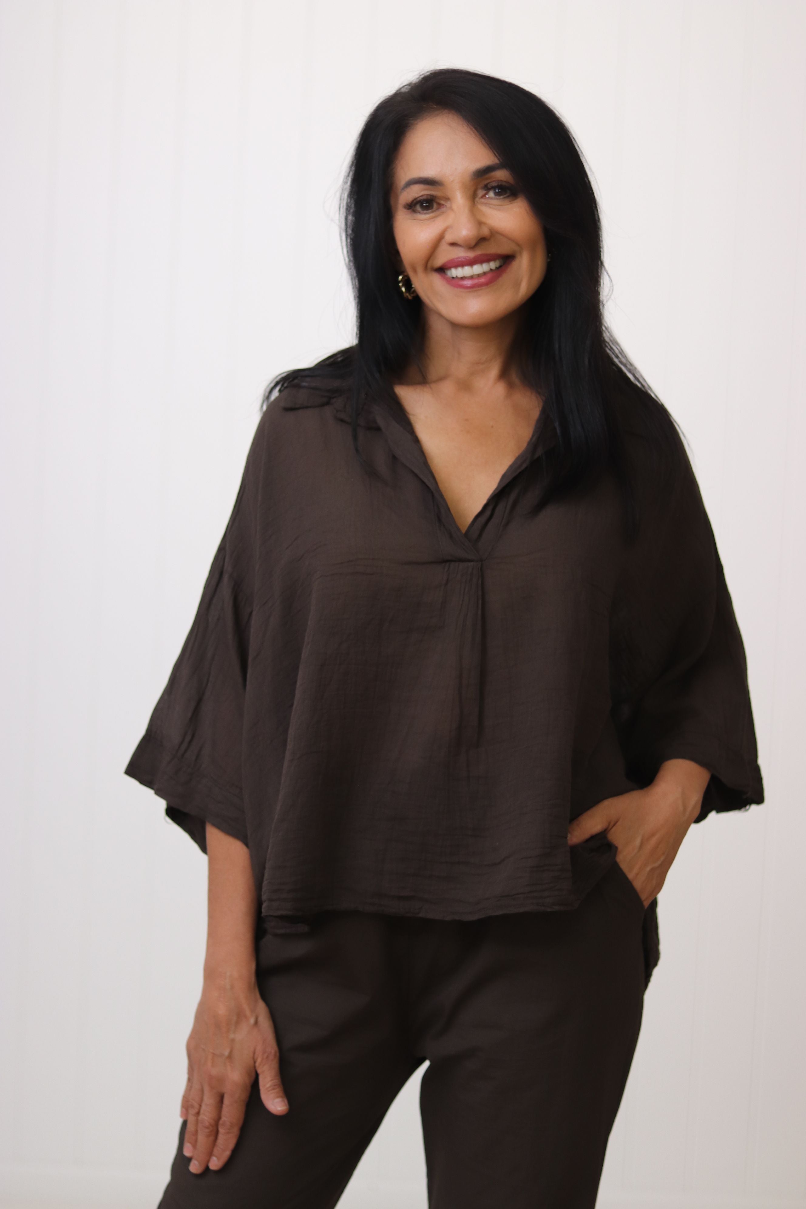 The Andrea V Neck Top features a stylish low V and collar neckline paired with 3/4 length sleeves for a balanced, elegant look. Crafted from lightweight, breathable cotton, it ensures all-day comfort while the longer back hem offers a modern silhouette. Perfect for those seeking both sophistication and ease in their wardrobe.