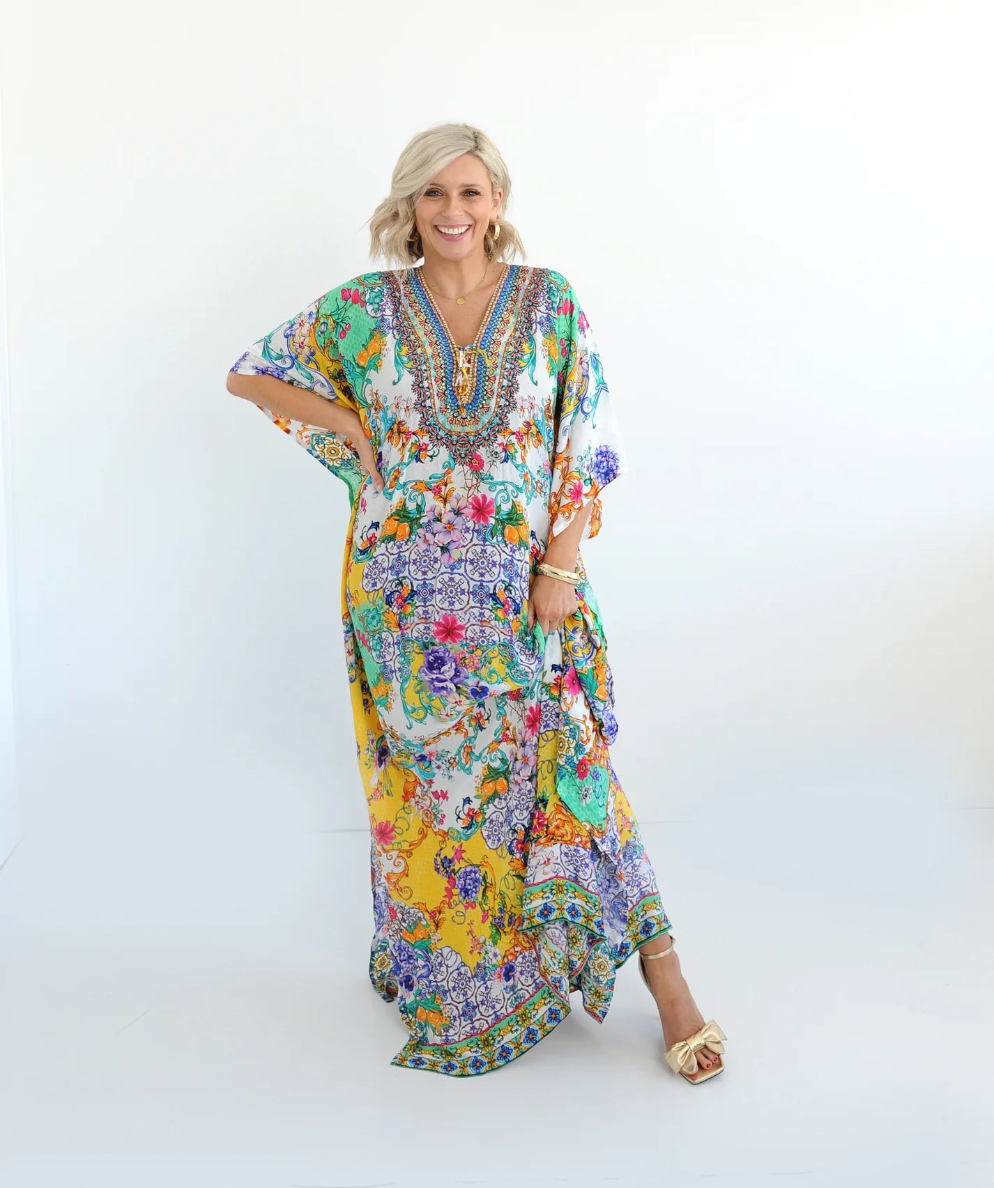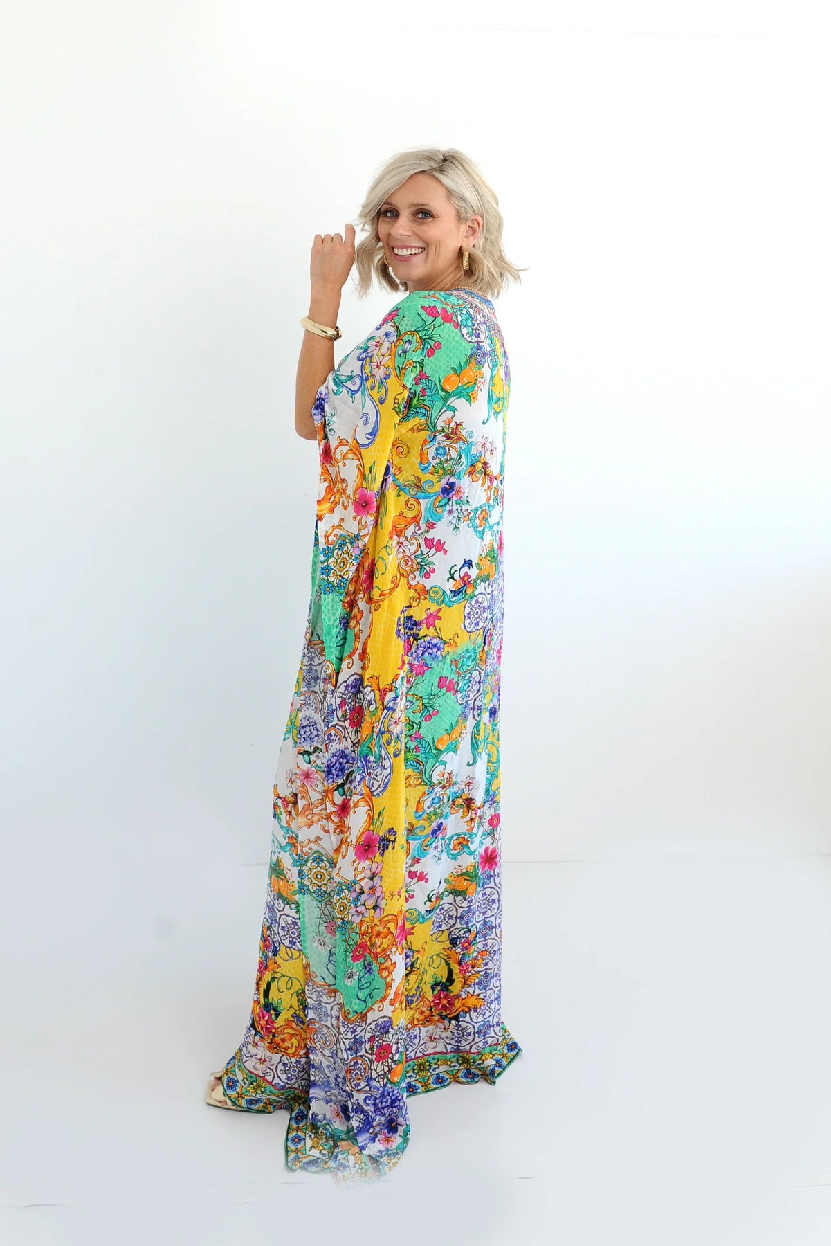 The Anna Long Kaftan is the perfect addition to your wardrobe. Its one-size design ensures a comfortable and flattering fit for all body types. The full-length style features a beautiful, eye-catching design and a gorgeous colorway. With longer sleeves and a tie-up neckline, this kaftan exudes elegance and sophistication.