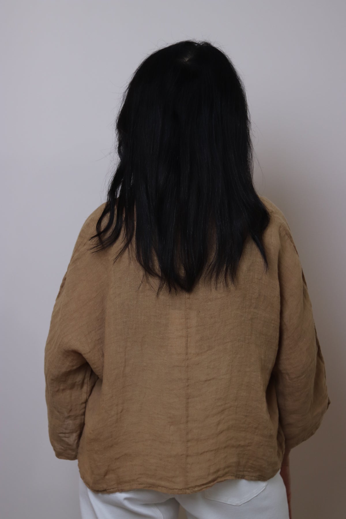 . Its flattering cropped silhouette and perfect arm length create a versatile, casual luxe look that effortlessly complements your favourite linen pants.