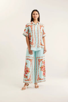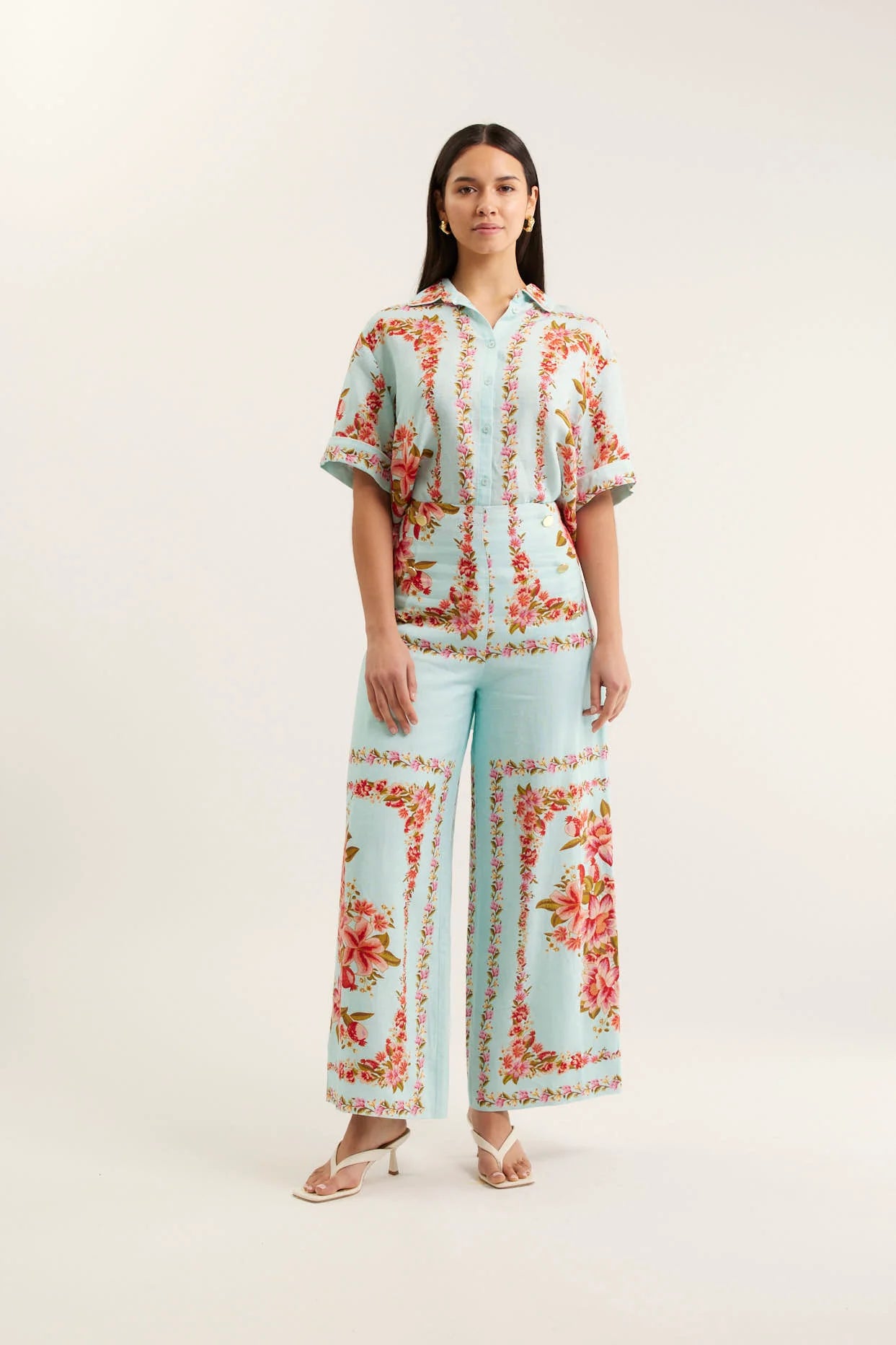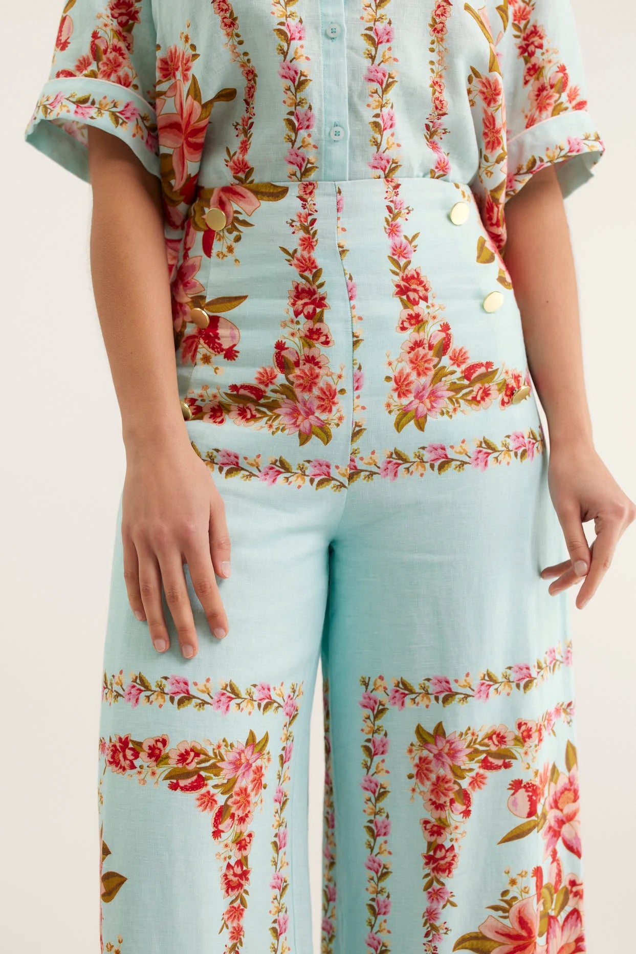 Experience the luxurious and breezy feel of our Atlas Linen Pant Portofino. Made from 100% natural linen, this pant features a refreshing Mint Portofino print and elegant seam details. The invisible back zip and gold button add a sophisticated touch, while the blind hem and back darts ensure a flattering fit. Cold gentle hand wash for easy care.