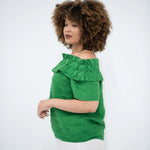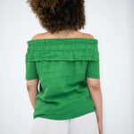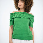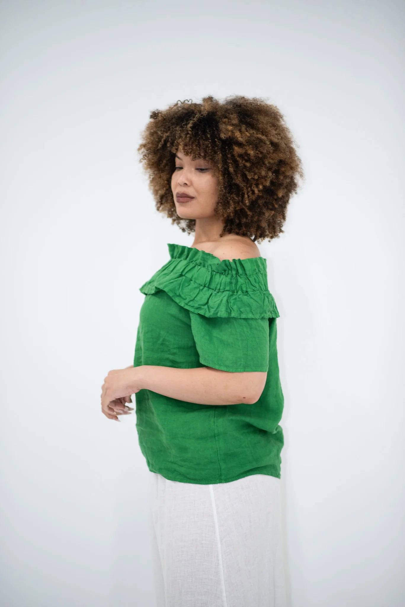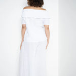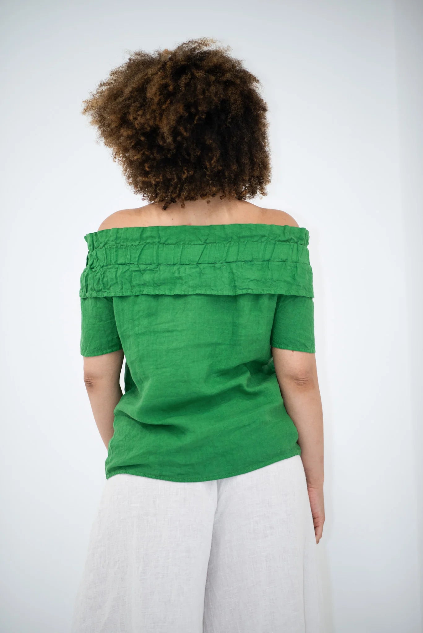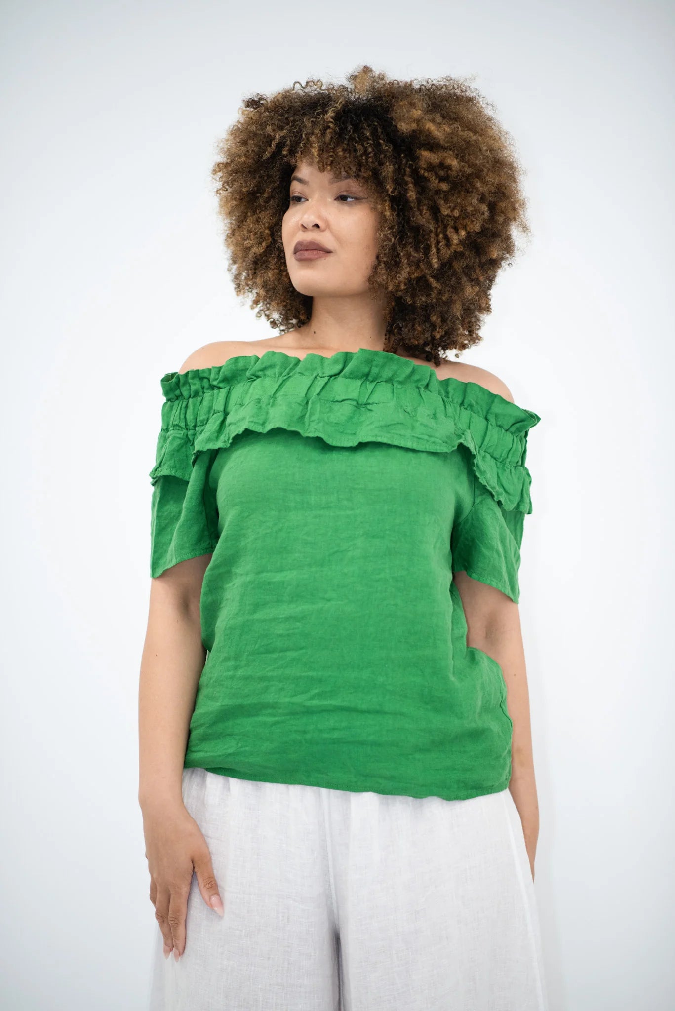 A defining design element—the wide, ruched elasticated frill adorning the boat neckline—introduces refined texture and graceful movement while elegantly framing the collarbone and shoulders. Versatile in its appeal, this piece transitions seamlessly from understated everyday elegance to polished festive styling, embodying the timeless ease that defines contemporary European design.