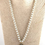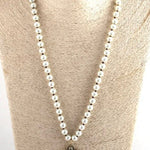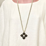 Elevate your everyday look with the divine Maia Cross Drop Necklace. This stunning piece features a pearl necklace accented with a bronze and precious stone cross. Adding a touch of lux with this unique accessory.
