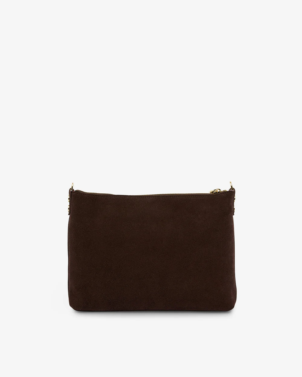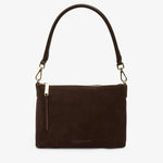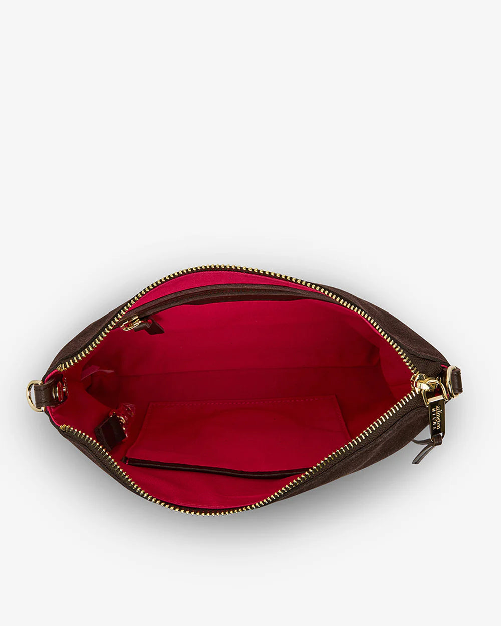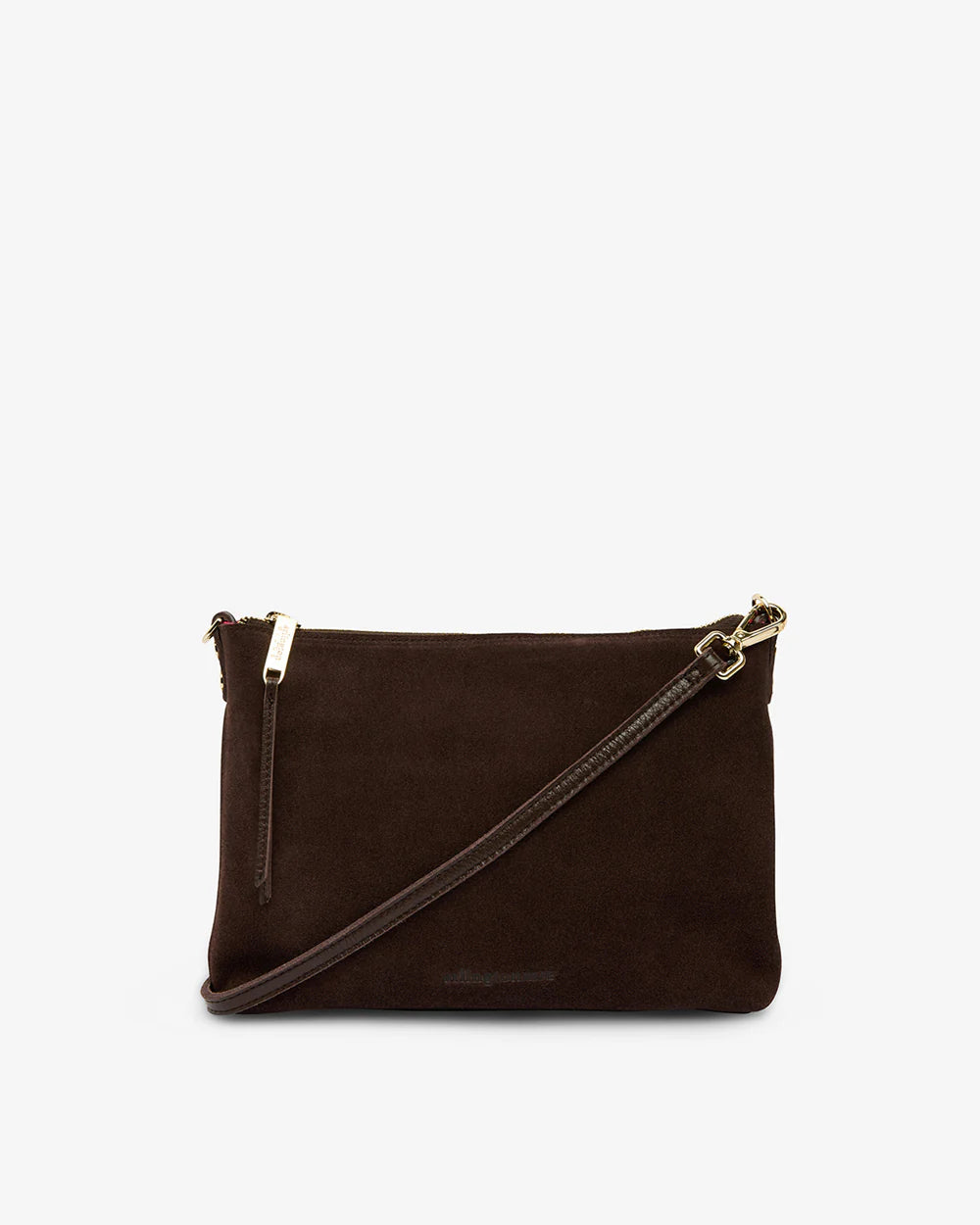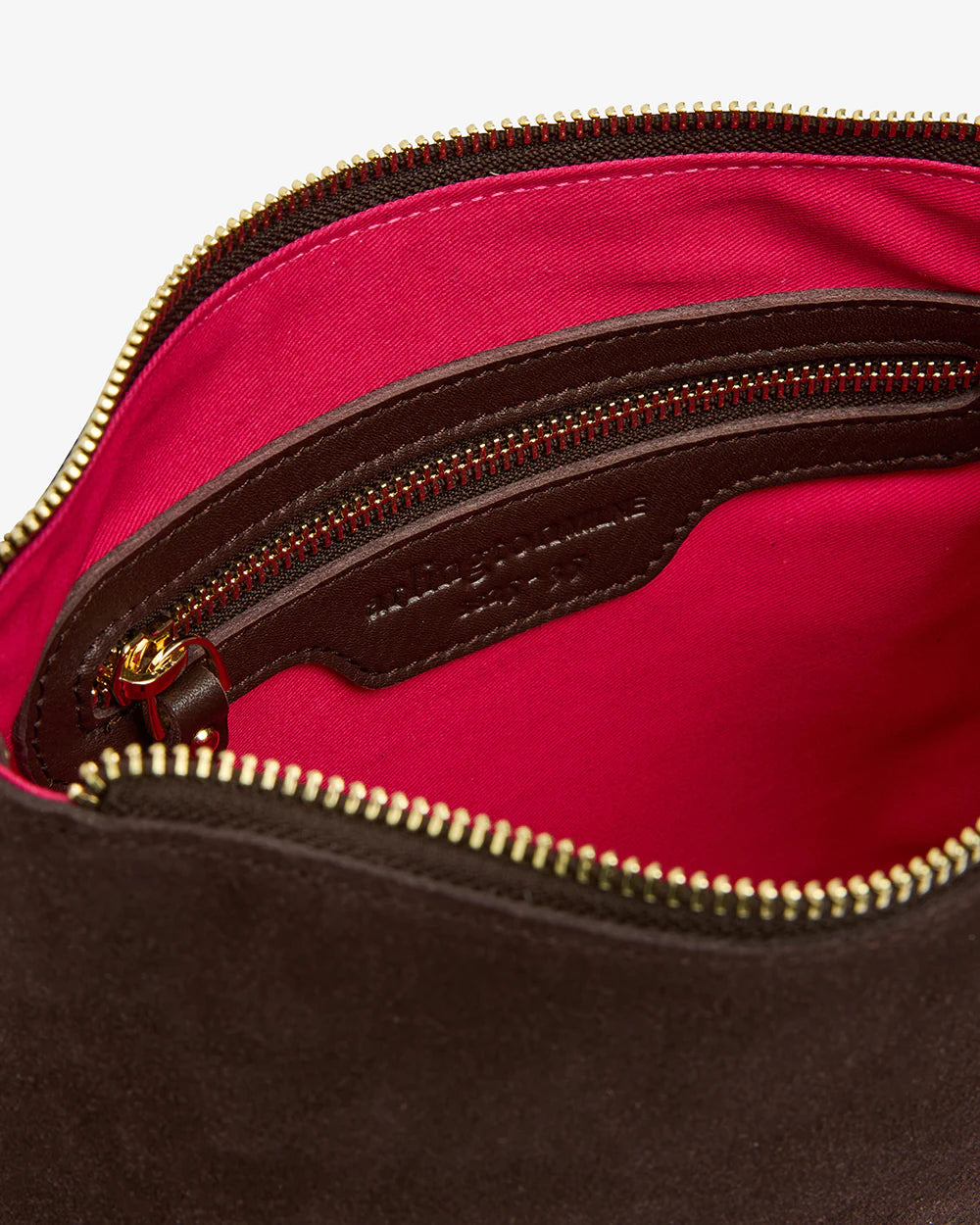 The Arlington Milne Baby Sophie Bag is crafted from premium suede. The petite member of the Sophie family, the bag offers three different straps, two rolled leather top grip straps, one in body leather and one in accent colour leather, and a longer, adjustable crossbody option. The secure top zipper opens to reveal an internal zip pocket, phone pouch and signature key clip.