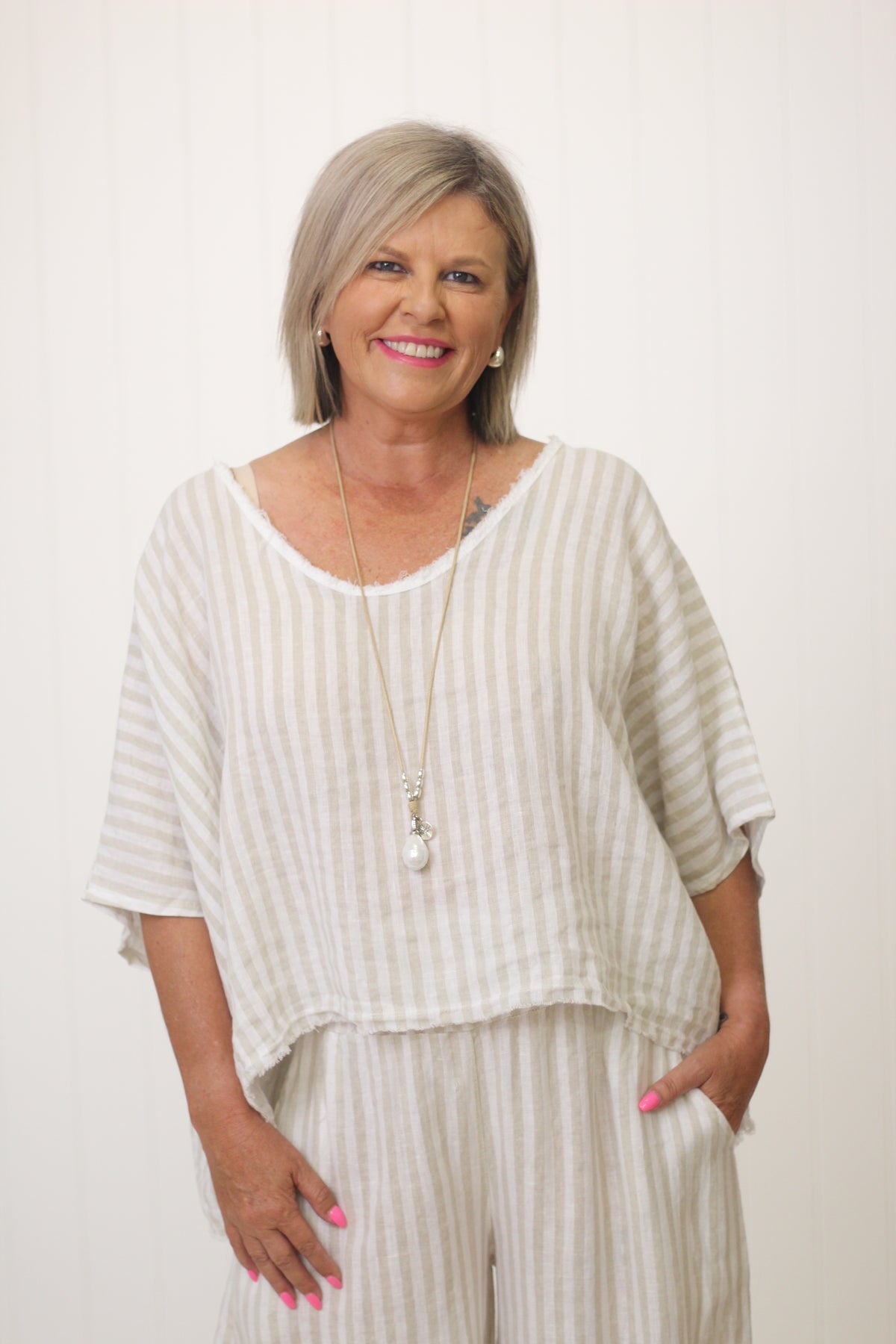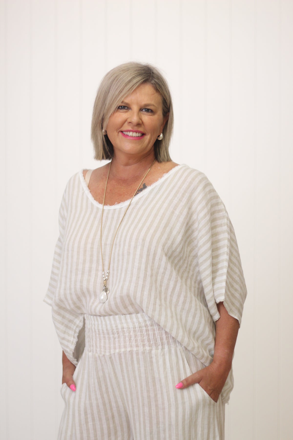 Kay is a size 10 and has styled with the matching Bahama Pants