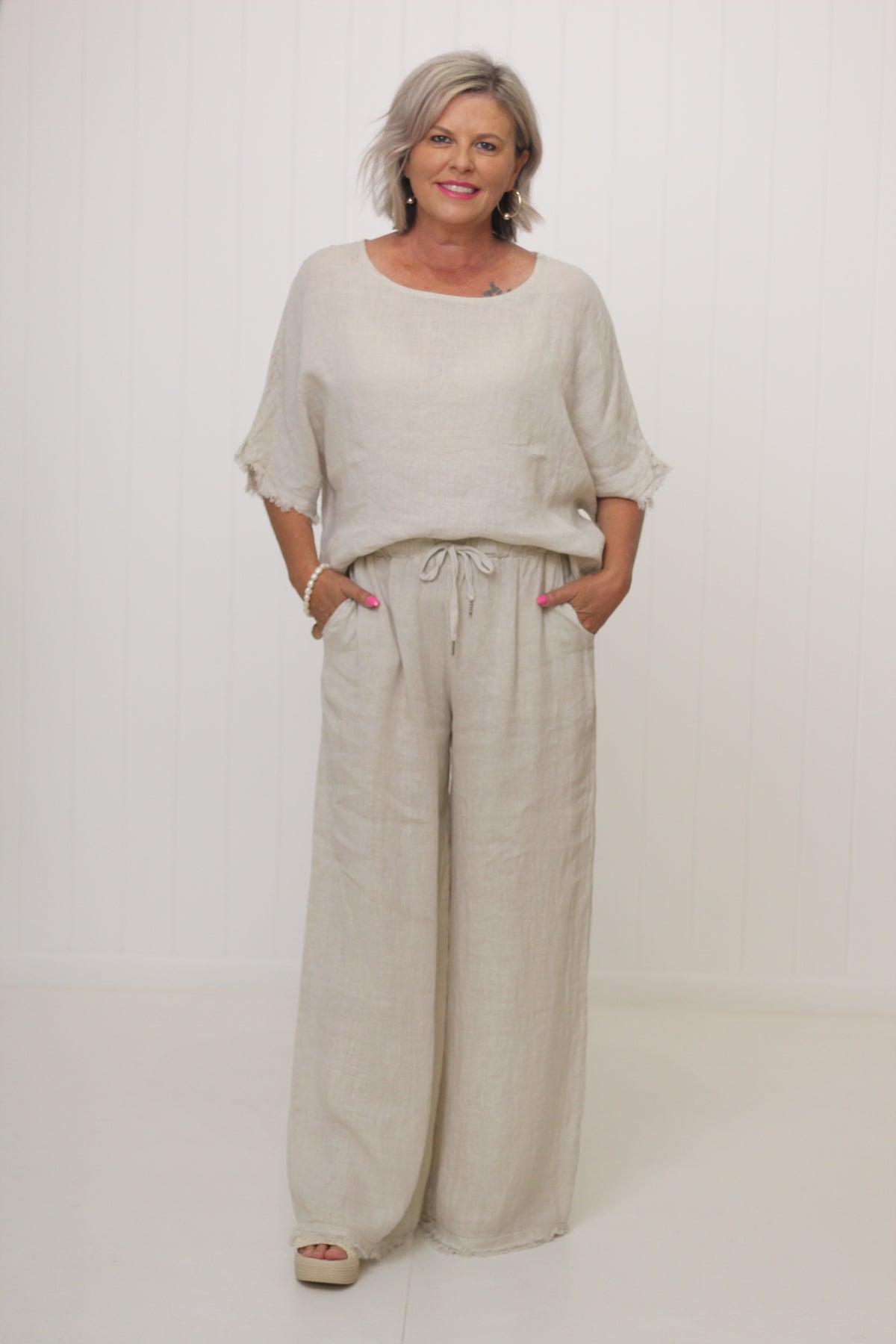 The Betina Pant made from 100% premium Italian linen, the Betina Pants are timeless offering both style and comfort. Featuring a chic frayed hem, these beauties add an effortless edgy touch to any outfit.