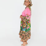 Decorated through the middle section with tropical florals and leafy green motifs, including hibiscus-style flowers and banana leaves, giving a lush, garden-like feel. The sleeves and hem feature a baroque-inspired border print with ornate, swirling patterns in tan, black, and coral hues.