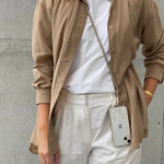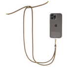 The cord features a taupe cord and a gold metal clasp attached to a patch that slips inside the back of a full coverage phone case. The connector patch is suited to all phone models with full coverage cases, which means the phone case covers all 4 sides of your phone, including the bottom where the charging port is located, as this is where the connector patch is inserted. This phone lanyard is designed to elevate your style while keeping your phone secure and your hands, free. The cord features a sleek and minimalist design that complements any outfit. The cord and connector patch can be easily adjusted to be worn in several ways including crossbody and over the shoulder.