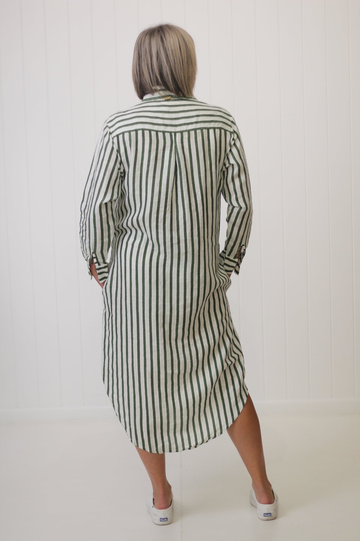 The Elena Dress offers a classic style that is both effortless to wear and versatile. Featuring convenient side pockets and a button-up design, it falls to mid-calf with a rounded bottom. Made from lightweight but not sheer 100% European flax linen, this dress fits true to size for a relaxed and comfortable fit.