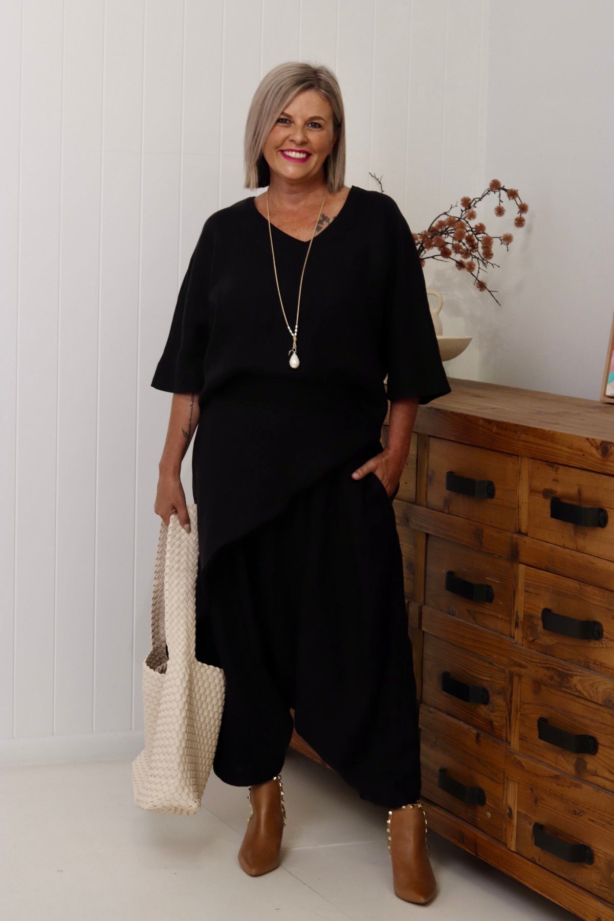 Kay is a size 10 and is wearing the SM. Kay has styled the Elliot Top with our matching Elliot Pant, Mahli necklace, Weave 2 piece bag and the Charlotte Stud Booties.