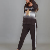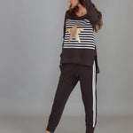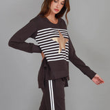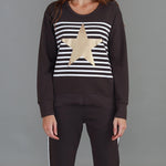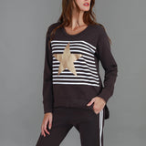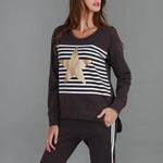 Expertly crafted with a bold stripe and star print, the Geneva Star Stripe Sweater offers both style and comfort. Made with French Terry fabric and featuring a crew neck and long sleeves, this sweater is perfect for any occasion. The hi lo hem adds a touch of modern flair to this timeless piece.