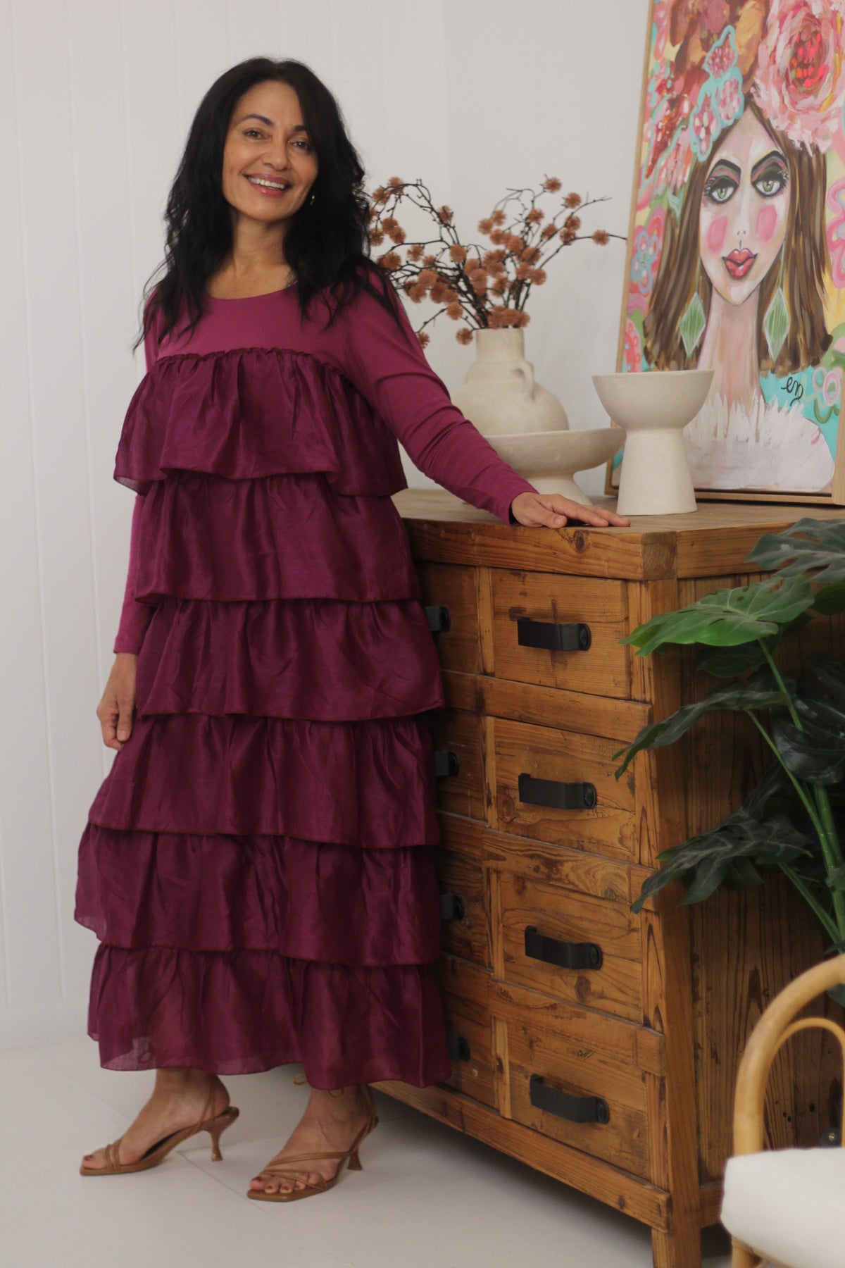 This dress is flattering on all sizes. The flounces are perfect and hide a multitude of sins! Remember to twist and crush from the shoulders down as this dress looks best with a deliberate vertical crush. This divine garment will look best after washing. It will soften, loose volume and fall beautifully. We love to twist and crush our linen garments but they can also be ironed.