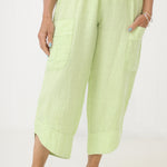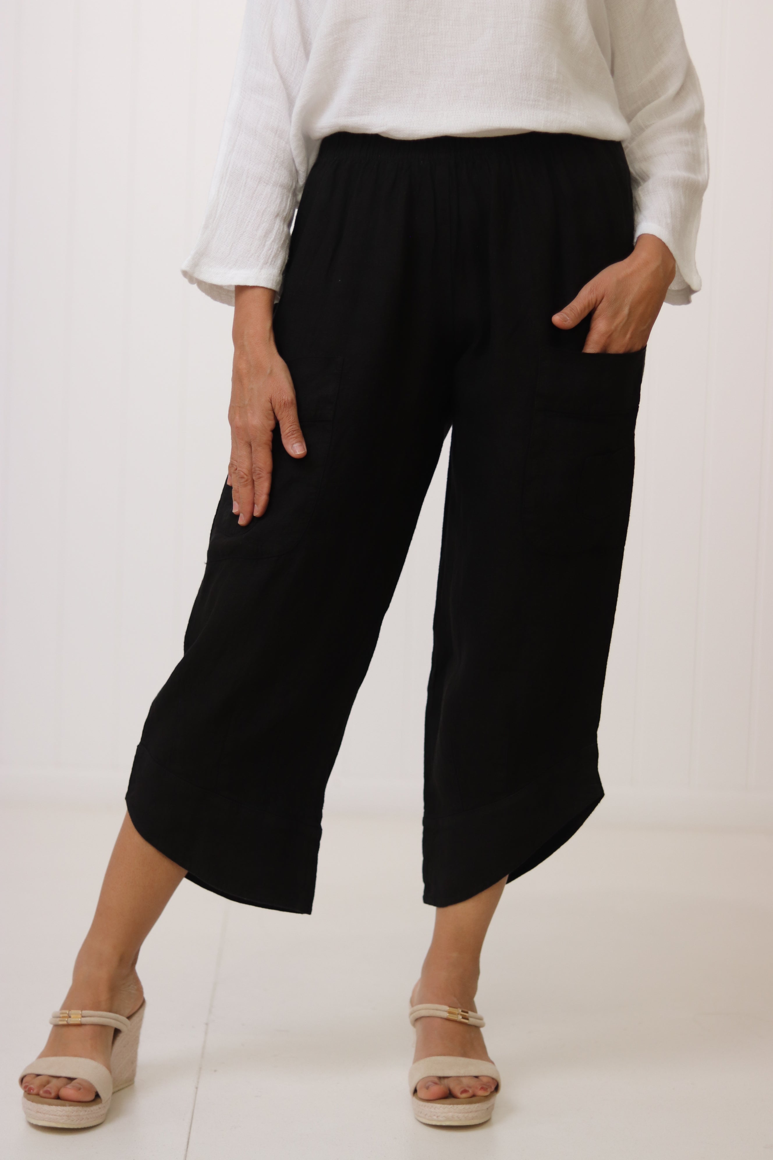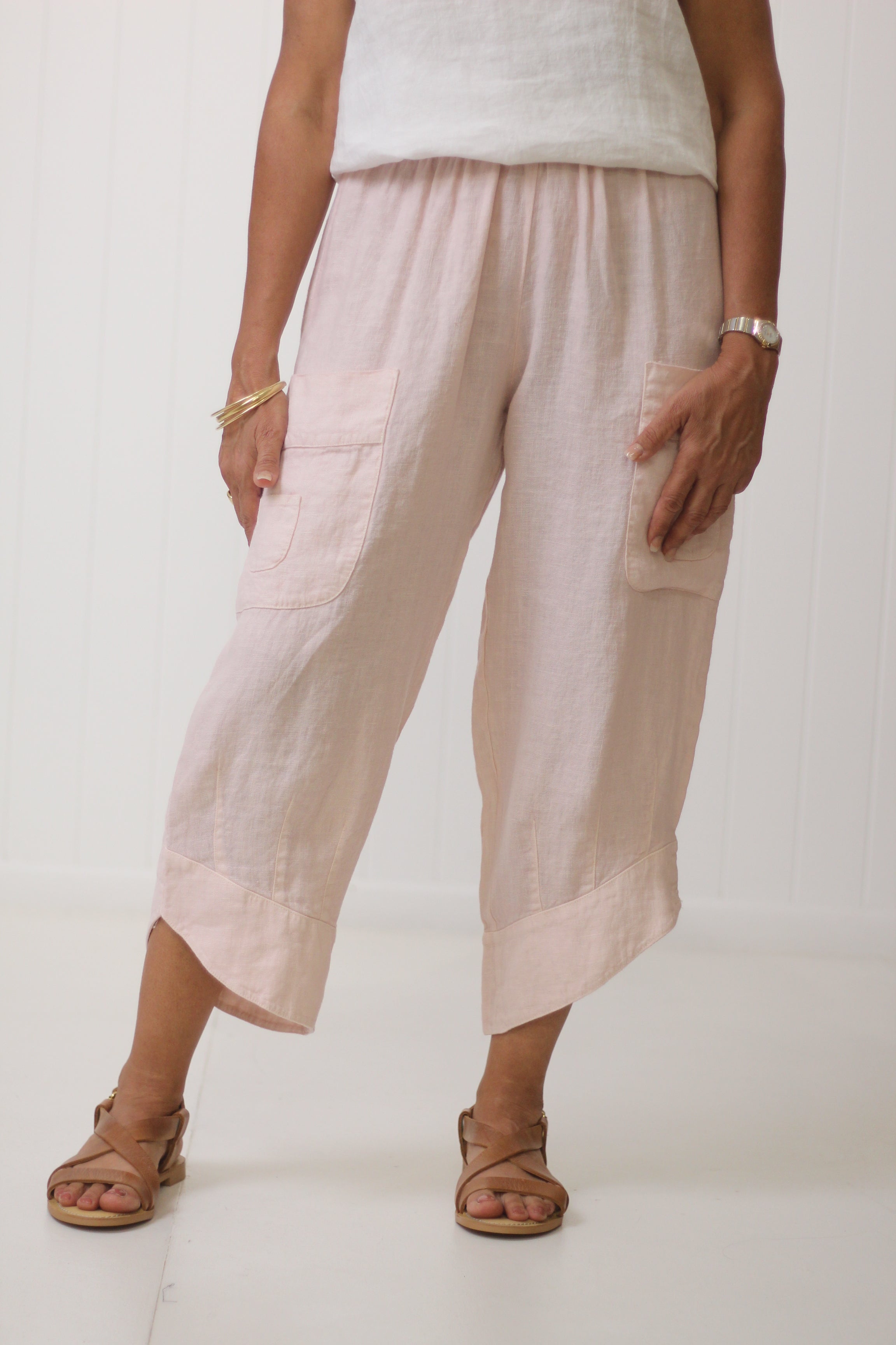 The comfortable elastic waist makes this pant suitable for many different shapes and sizes. Made from beautiful quality soft Italian Linen these beauties will be sure to become a firm favourite. They've been created with a point of difference, the interesting hemline and stylish detailed front pockets.