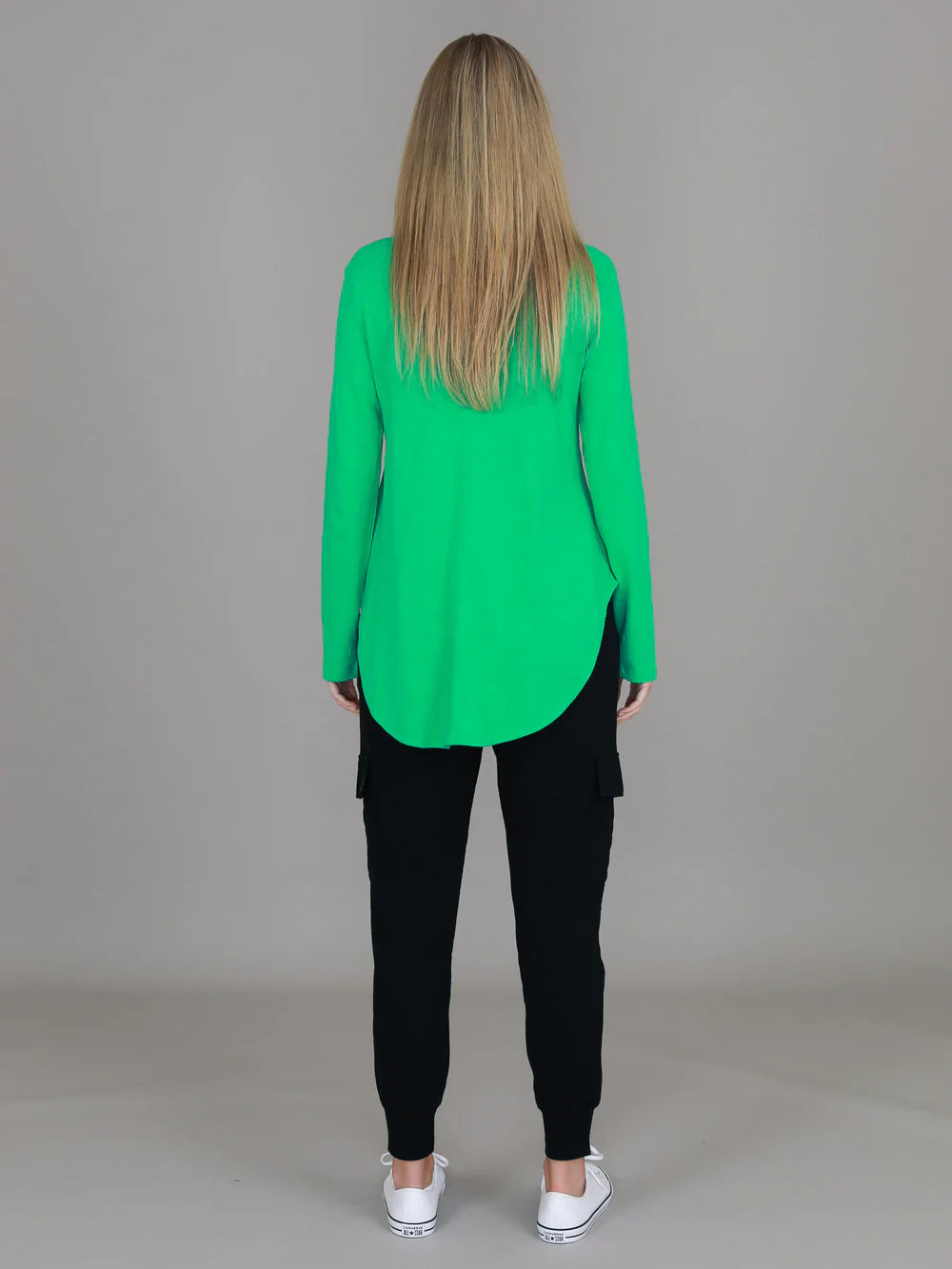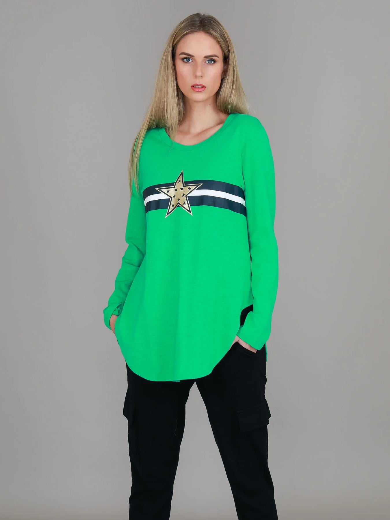 This Jolie Gold Star Graphic Tee is perfect for everyday casual wear. It features a curved hem and long sleeves for added comfort. The green t-shirt is adorned with an eye-catching gold star graphic, adding a standout feature on this tee.