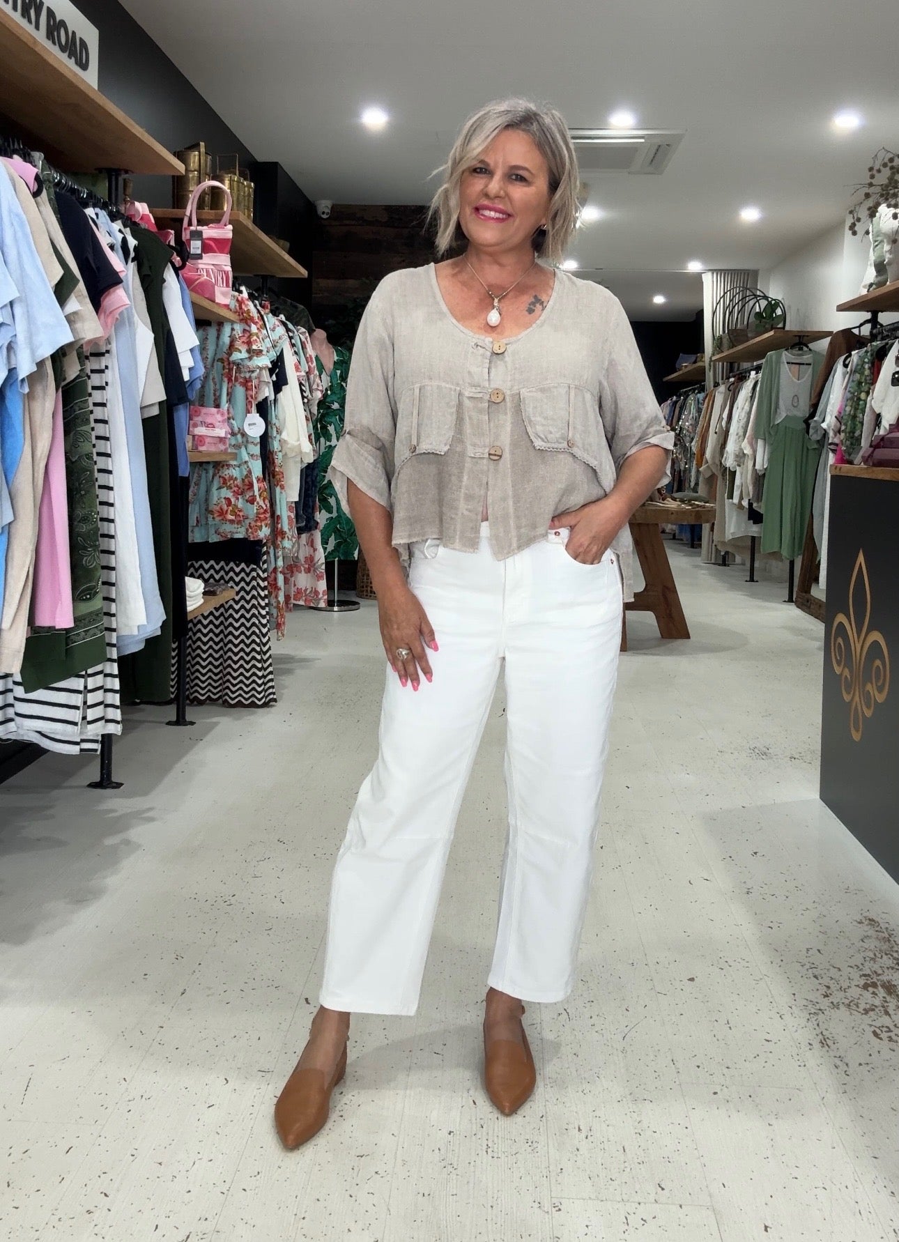 Drina is a size 8 and has styled the Jordyn Top with the Tamara Pant and the Immacolata Pant.