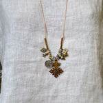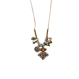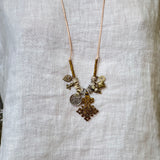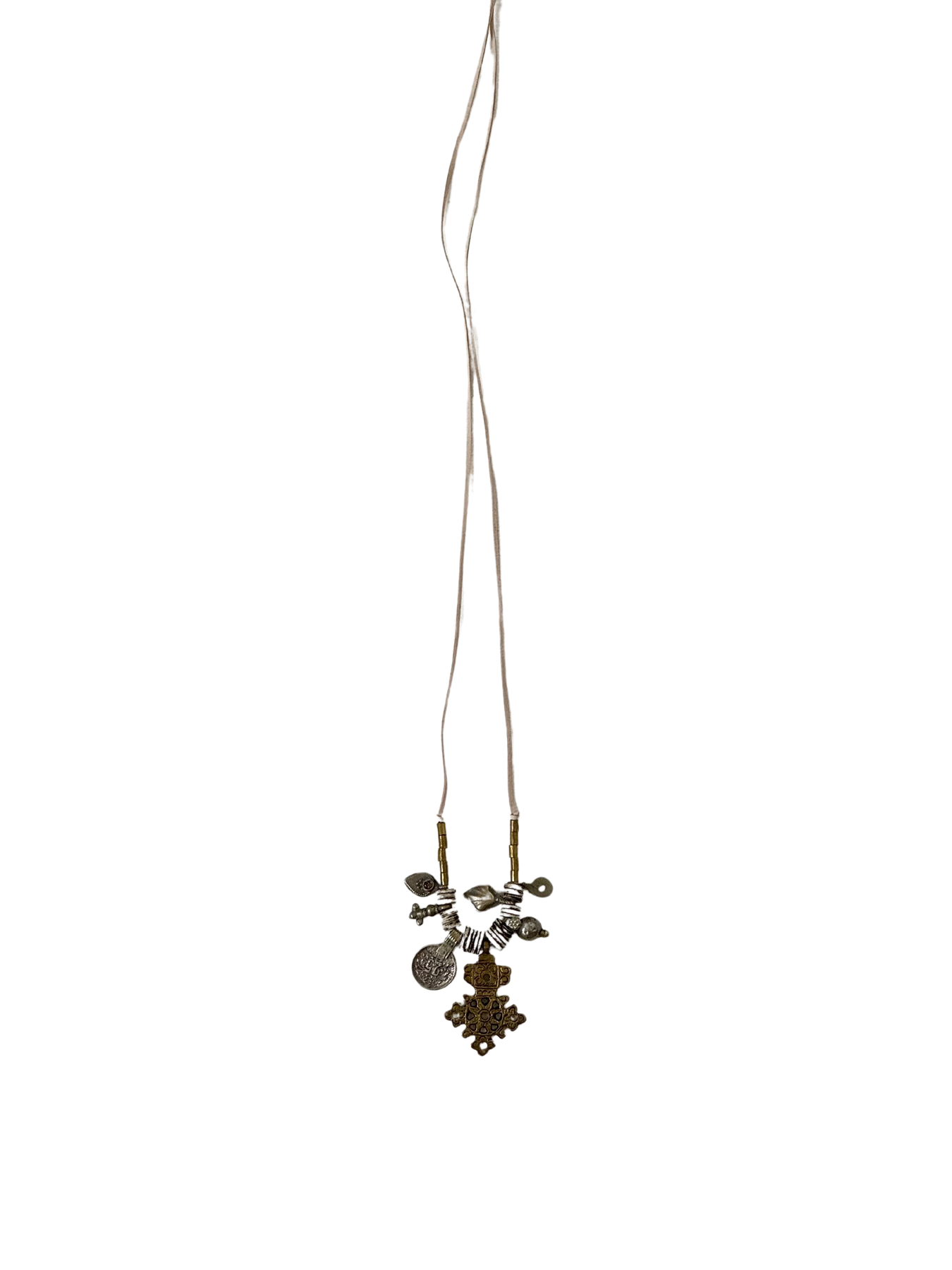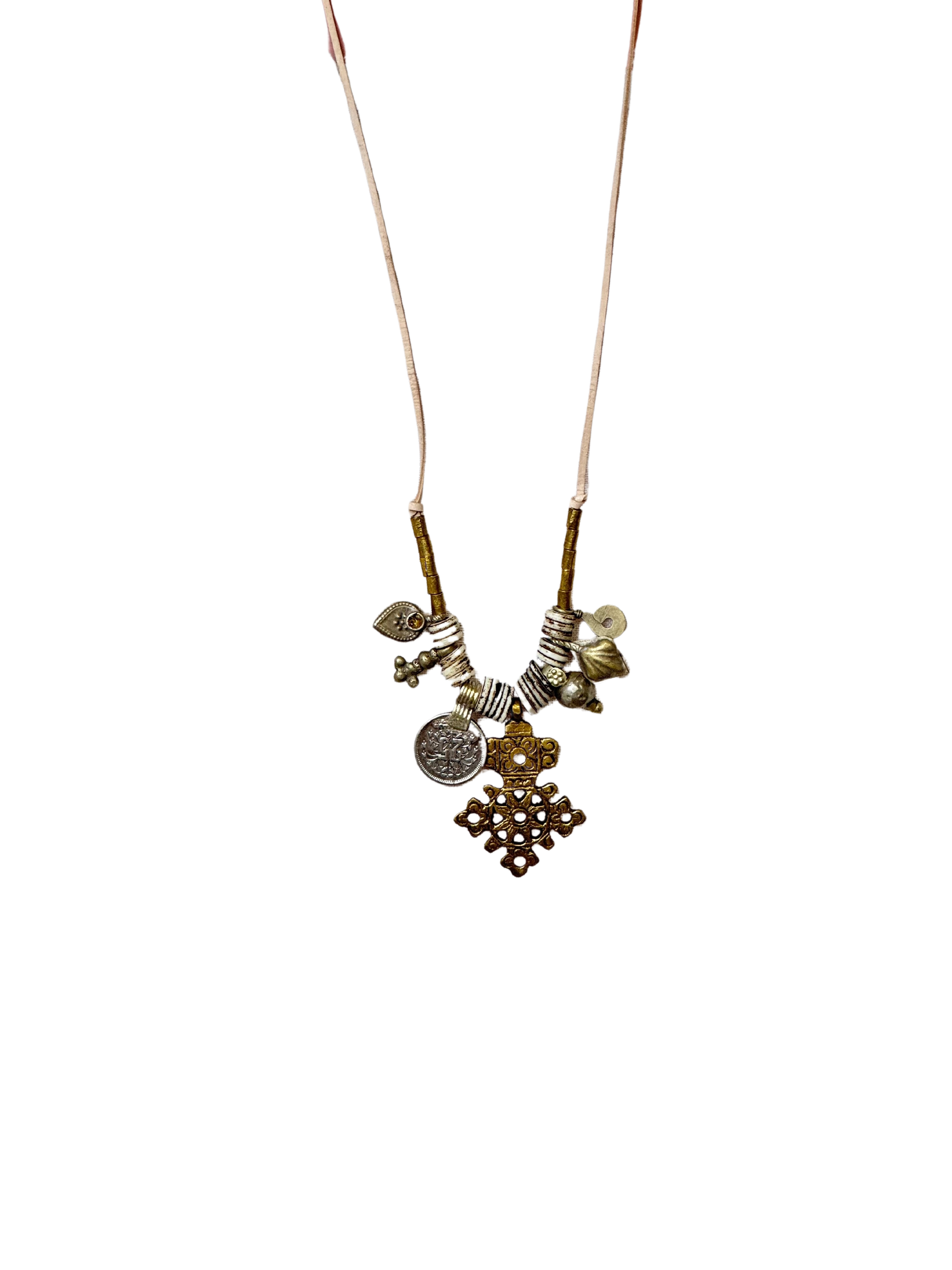 This vintage silver and bronze necklace is a unique and timeless piece. The combination of materials—leather, silver, and bronze—adds a touch of rustic elegance, making it a versatile accessory for various outfits. It can complement a casual style and adds a bit of vintage charm to your look.