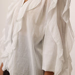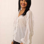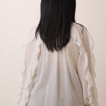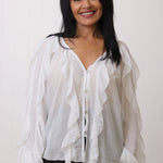 The Leah Button Shirt features a delicate ruffle design along the front and sleeves, adding subtle elegance to its lightweight cotton fabric. With long sleeves and a low neckline, it balances comfort and style effortlessly. The button-up front offers versatility, making this shirt a refined choice for both casual and professional settings.