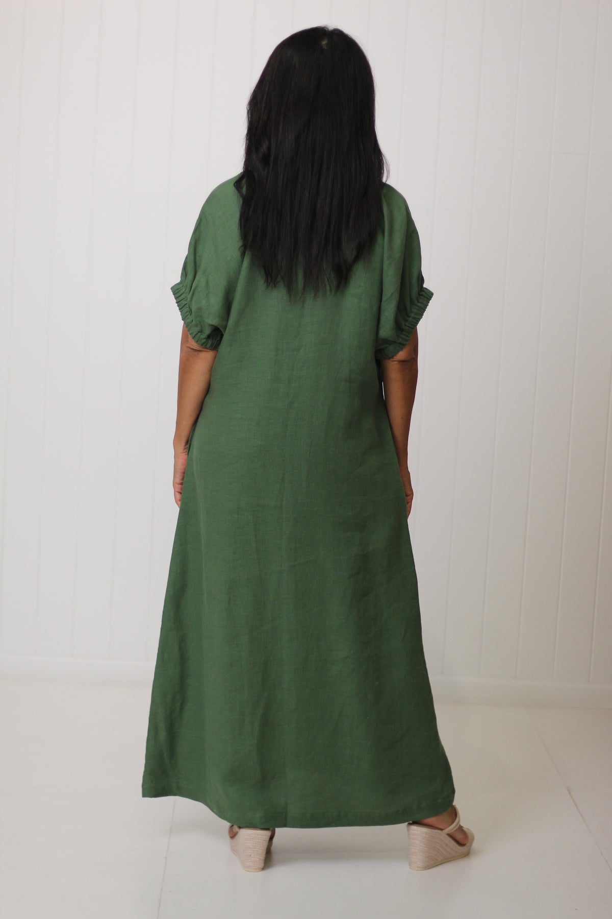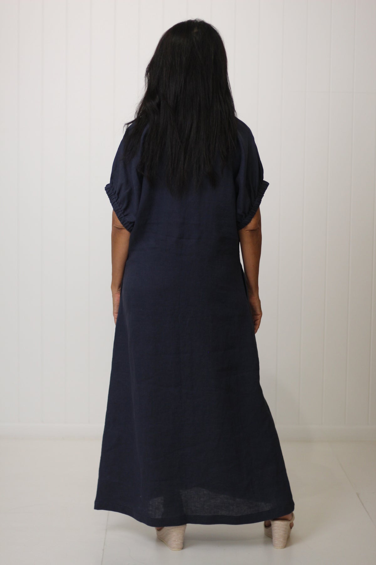 Designed for effortless sophistication, the Linda Dress in a maxi length. Where wouldn't you want to wear this. Seamlessly practical yet stylish. The flattering V-neckline and chic side split create an elegant silhouette, while the elasticated cuffed sleeves and hidden pockets add both charm and convenience. A beautiful dress for all so many body types. Crafted from soft, breathable linen, this dress offers all-day comfort without compromising on style.
