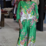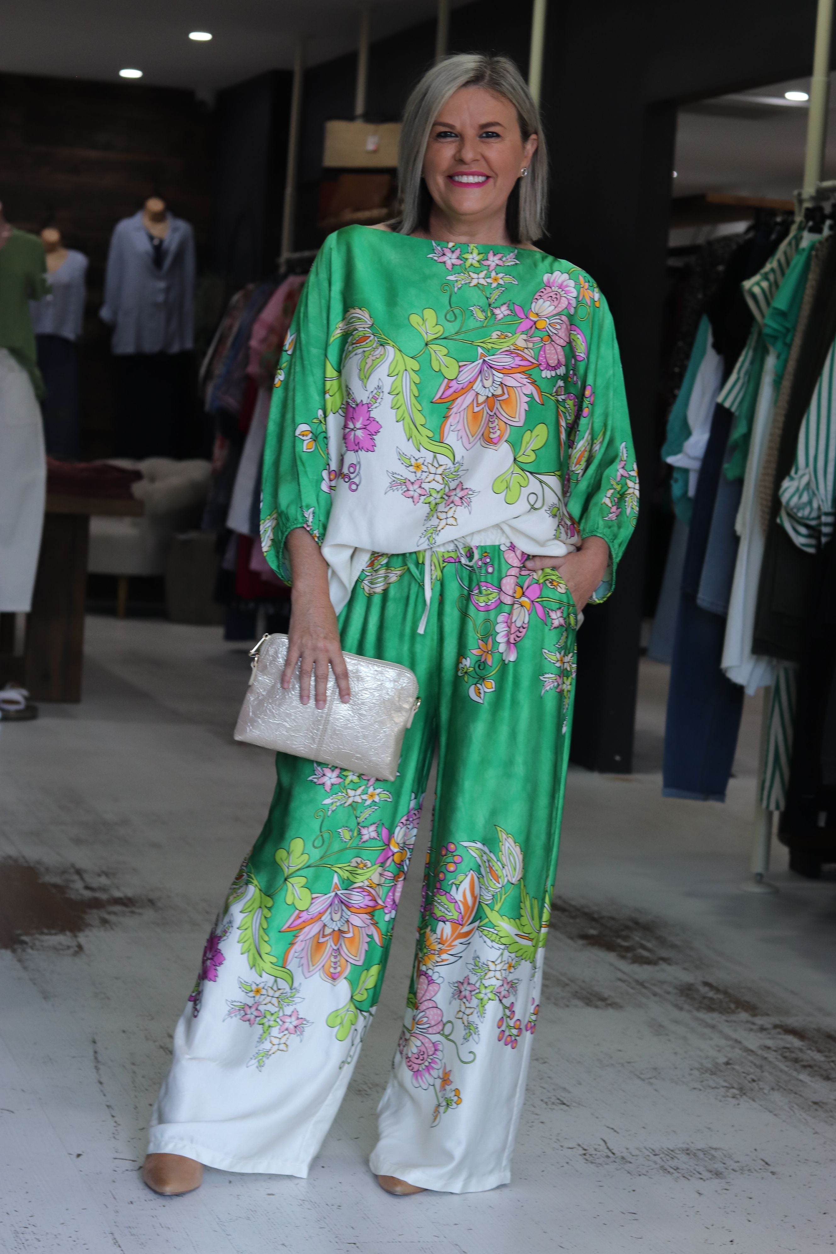Kay is a size 10 and has styled the Lisa silk top with the matching Lisa silk pants.