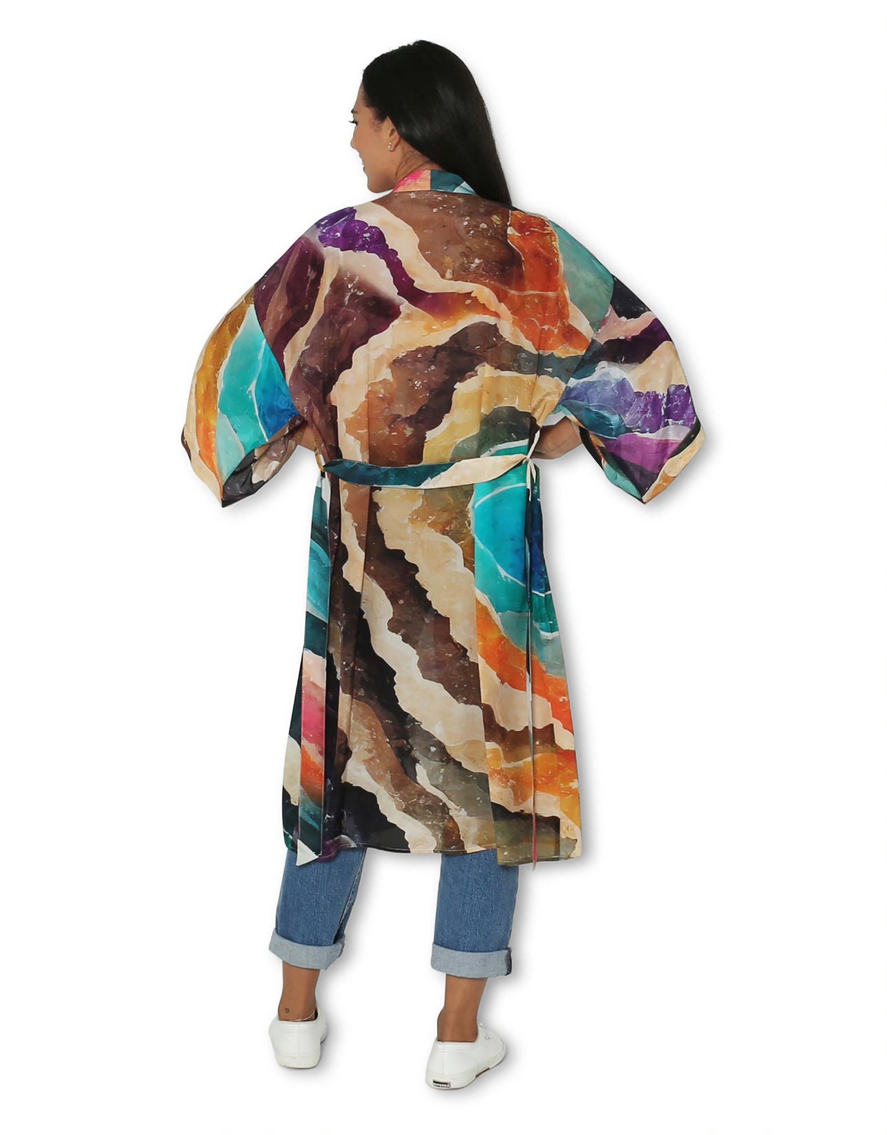 Stunning, unique kimono 100% Silk Chiffon, the softest kimono you will ever wear. The material is a 100% natural fibre sourced from different woods so it is breathable, warm and yet will not overheat. Each style is a replica of a hand painted art work by one of our commissioned artists.