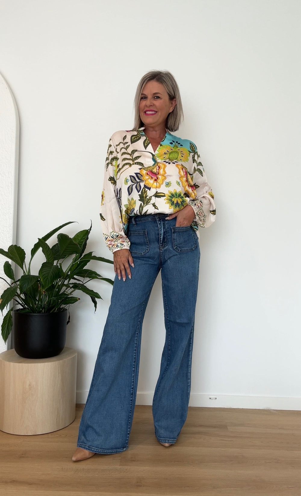 Kay is a size 10 and has styled the Posy Shirt with our Freya Jean Ecru and the Harper Jean Waterfall.