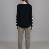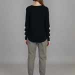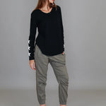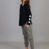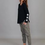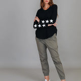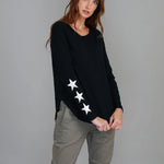 The Rita Star x6 Long Sleeve T Shirt offers a trendy look with its star prints along the sleeves. Made from cotton jersey, it features a crew neck and curved hem for added comfort and style. Elevate your wardrobe with this must-have shirt.