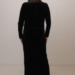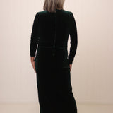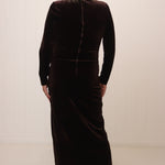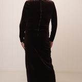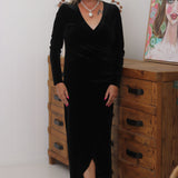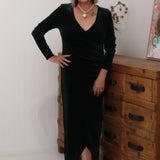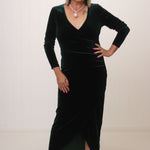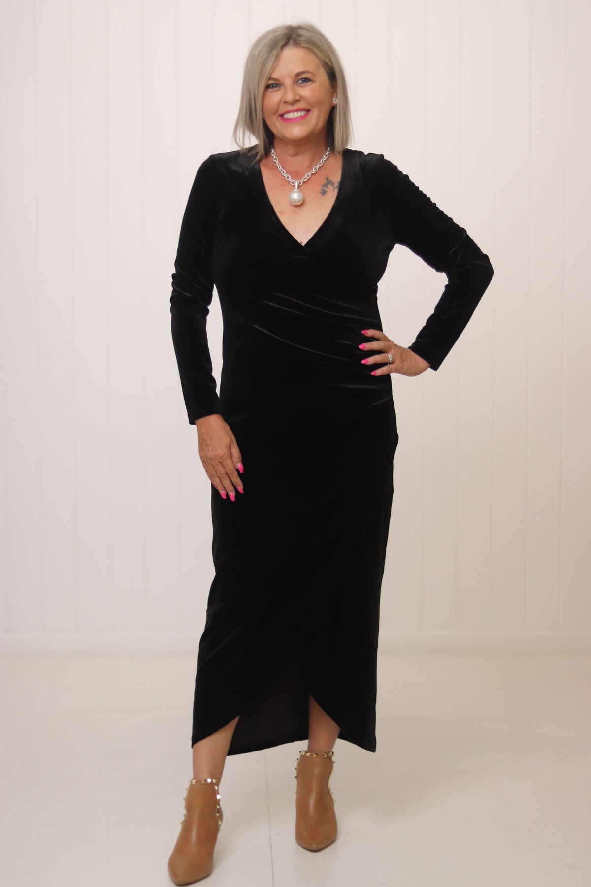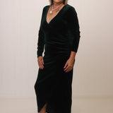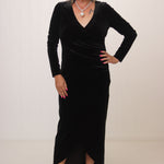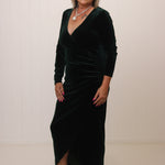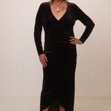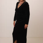 Unveil your bold femininity with the Romantic Edge Dress—a stunning blend of softness and structure. Crafted from luxuriously soft stretch velvet, this tailored midi-length dress contours beautifully to your shape while offering all-day comfort. The surplice crossover neckline creates an effortlessly elegant silhouette, complemented by delicate gathering throughout the bodice for a flattering fit.