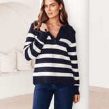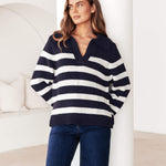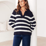 Stay warm and stylish in our Sally Stripe Knit. Made from a blend of acrylic and cotton, this soft and stretchy jumper features a cosy collar and V-split detail. The relaxed long sleeves taper at the cuffs, while the straight silhouette and side splits make it perfect for layering. Available in lovely navy blue and white stripes.