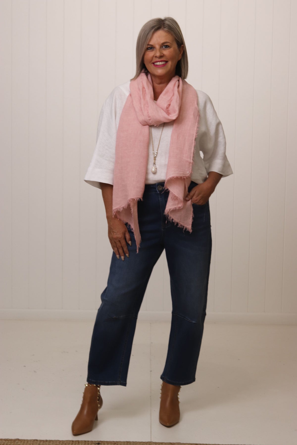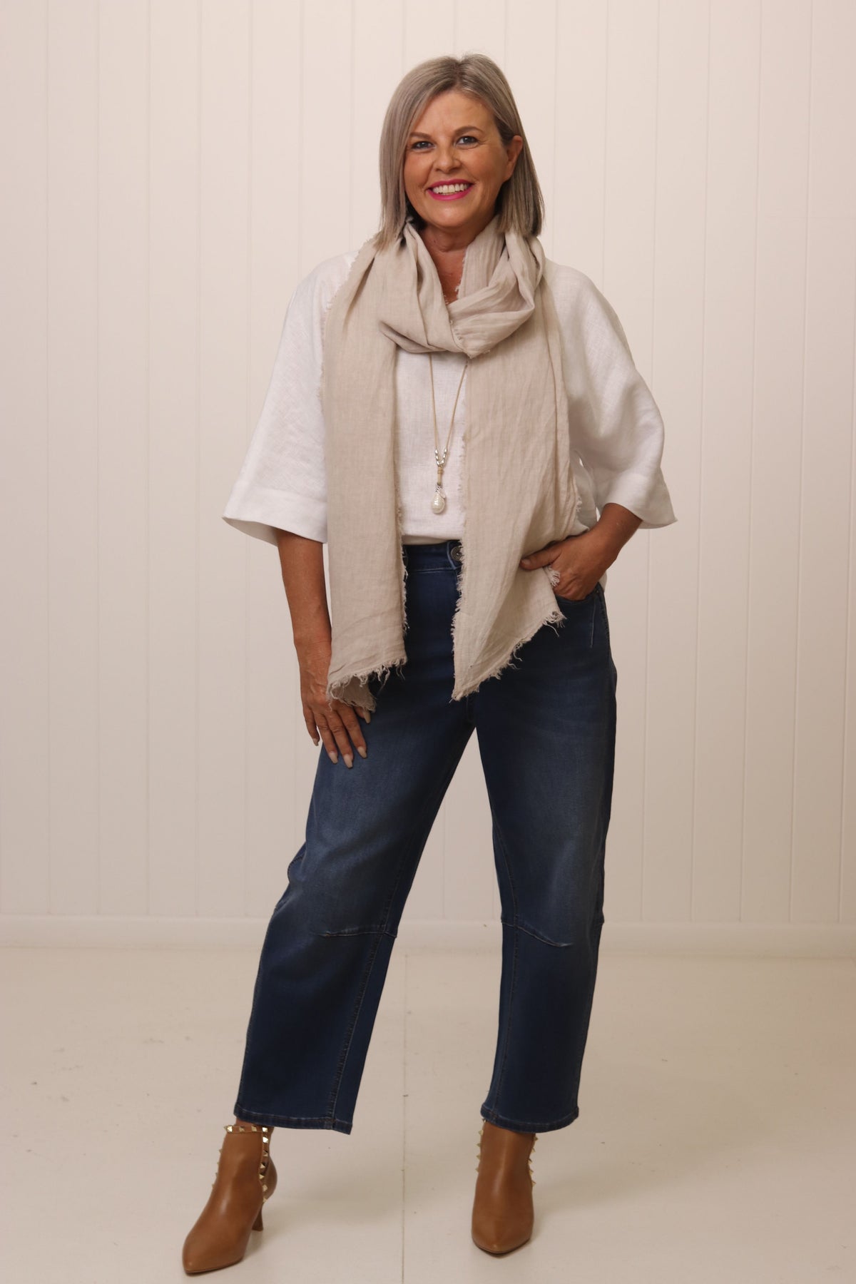Kay has styled the Sicilian Scarf with the Quincy Top, Mahli Necklace, Charlotte Stud Booties and the Toni Barrel Jean.