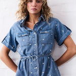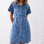 The Simone Dress is the easy mini shirtdress with a cool twist. Featuring patch utility pockets, buttons all down the front and an embroidered heart detail this is one-and-done kind of style that can be paired with sneakers for a cool, casual vibe.
