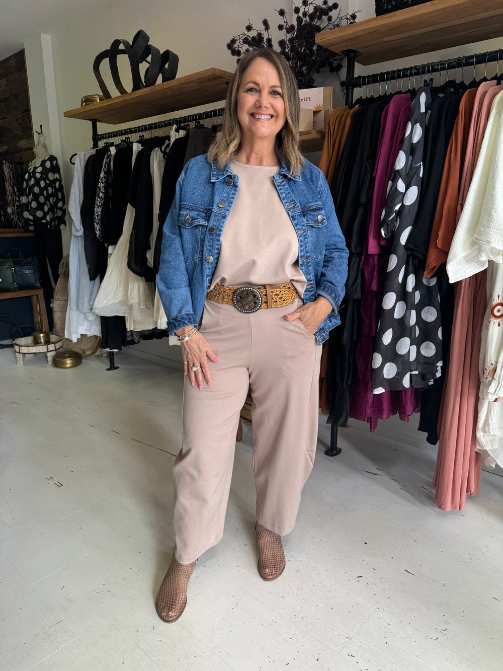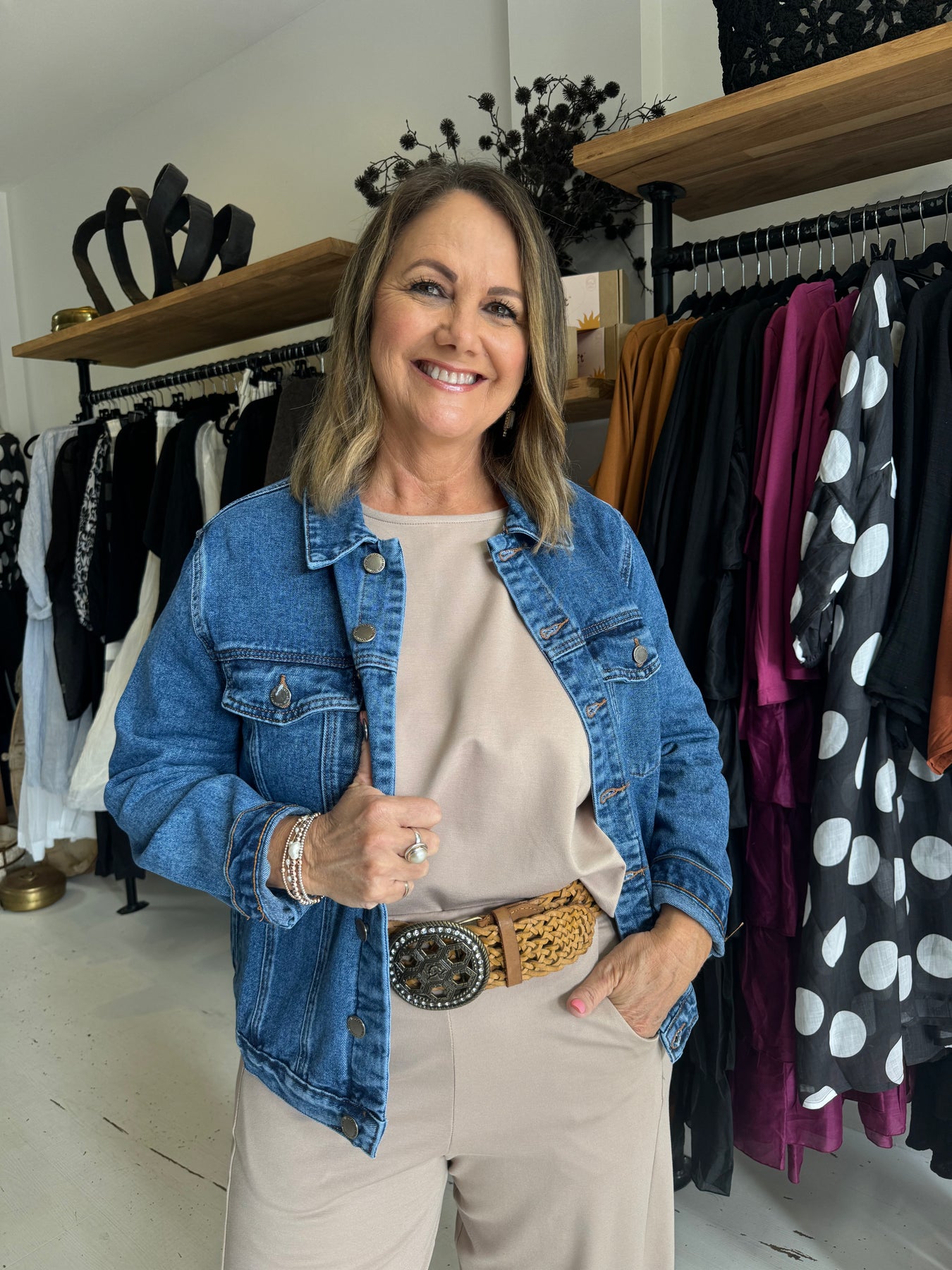 Kath is usually a size 14 and has styled the Slouchy Denim Jacket Dark Denim (size 12) with our Sweet Leisure set and Corscia Belt saffron