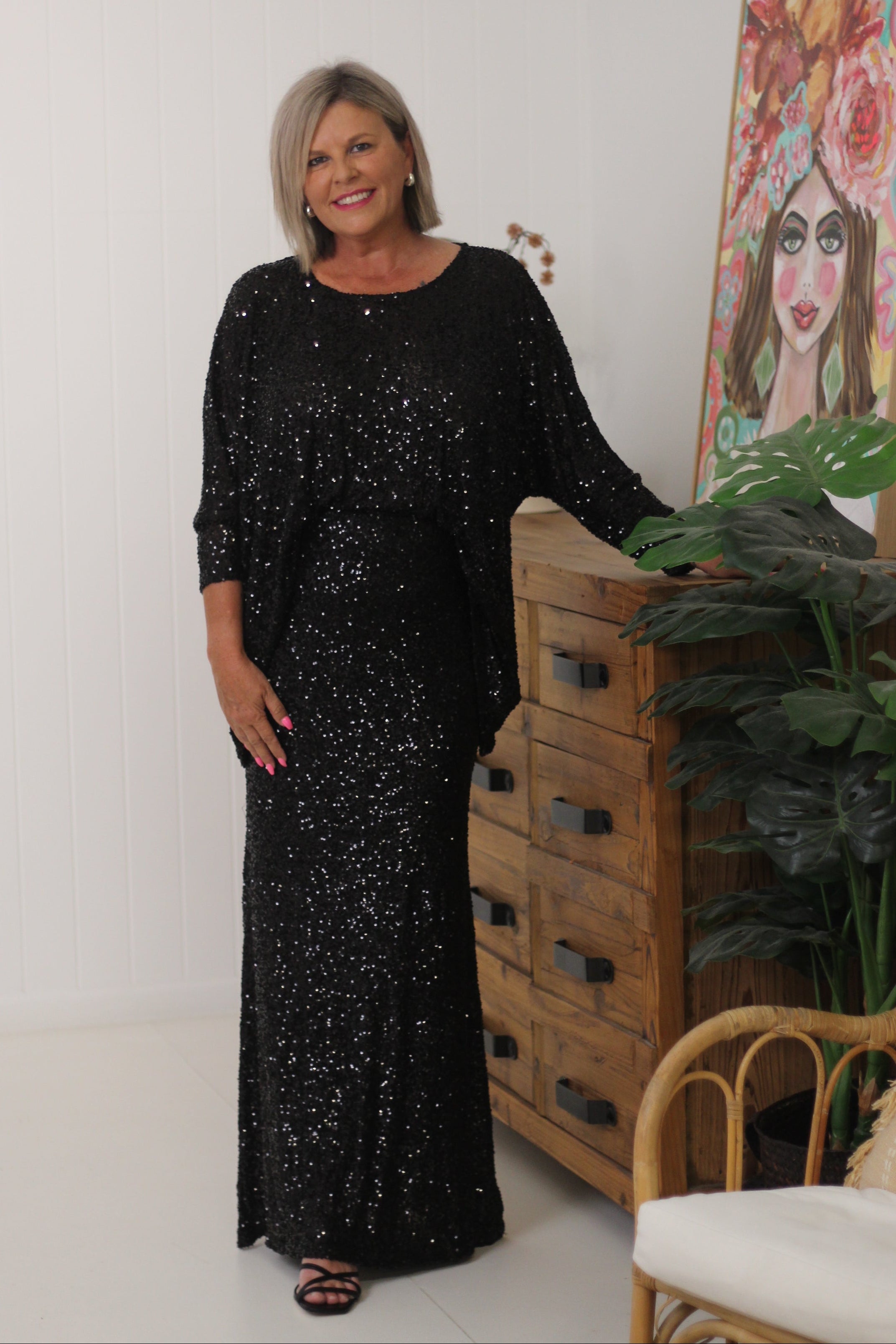 Kay is a size 10-12 and is wearing the size SM. Kay has styled the Suzie Sequin Skirt with our Mitzy Silk Top (IN STORE ONLY) and the matching Kelli Sequin Top