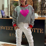 The Sweet Heart Sweat combines a cool, contemporary vibe with a striking pink heart set against dark navy stripes and accented by bold red trim.