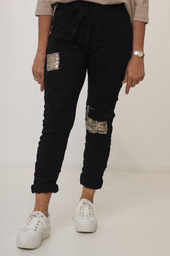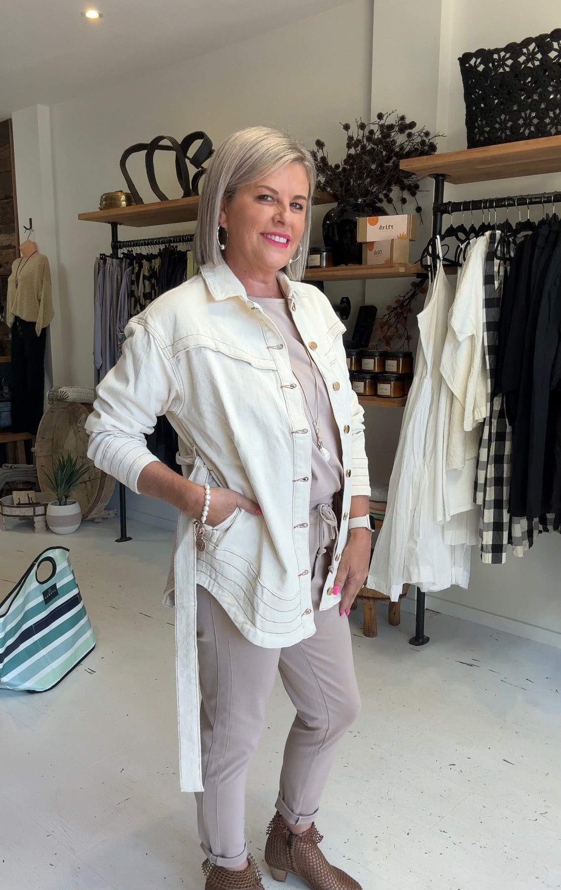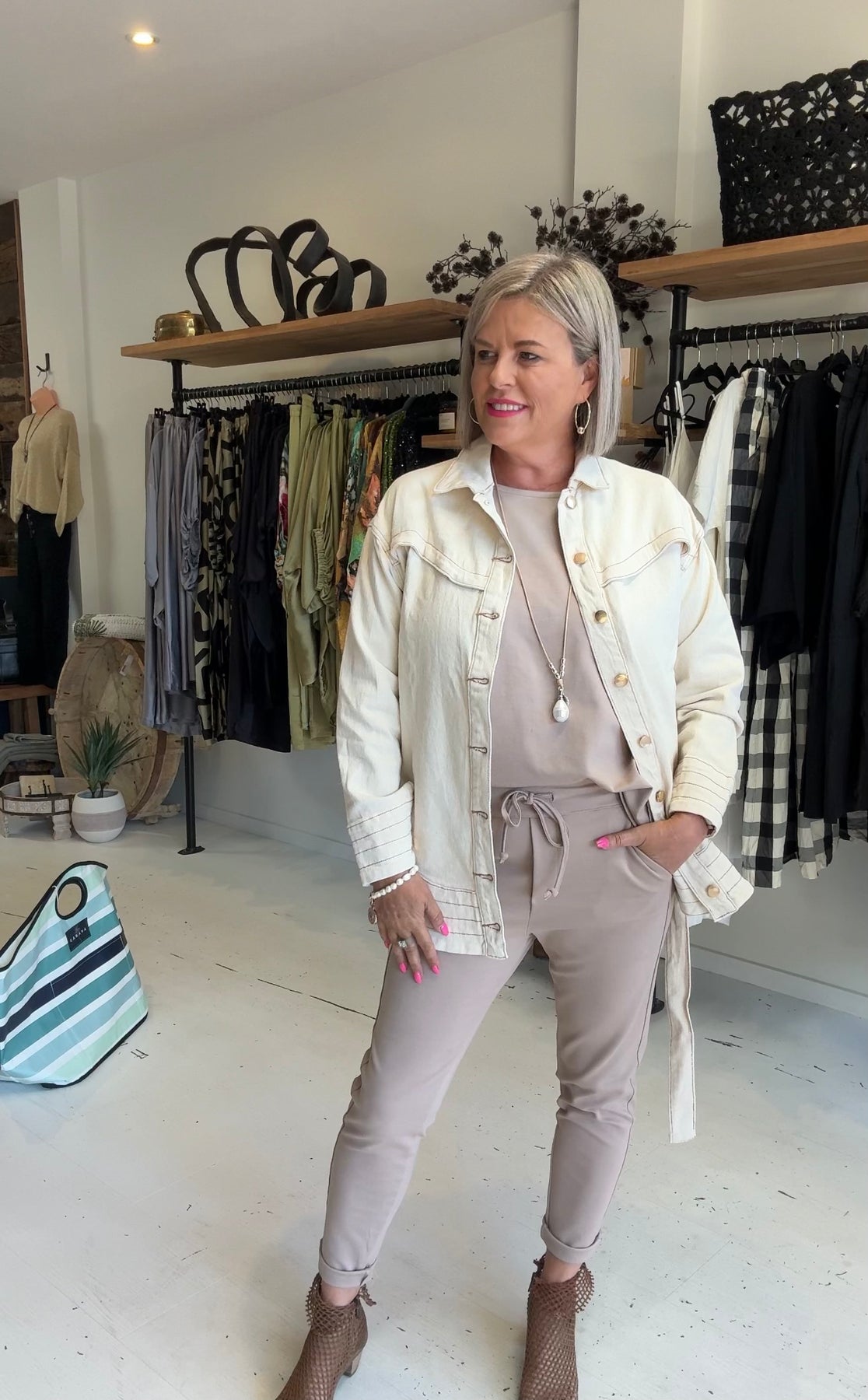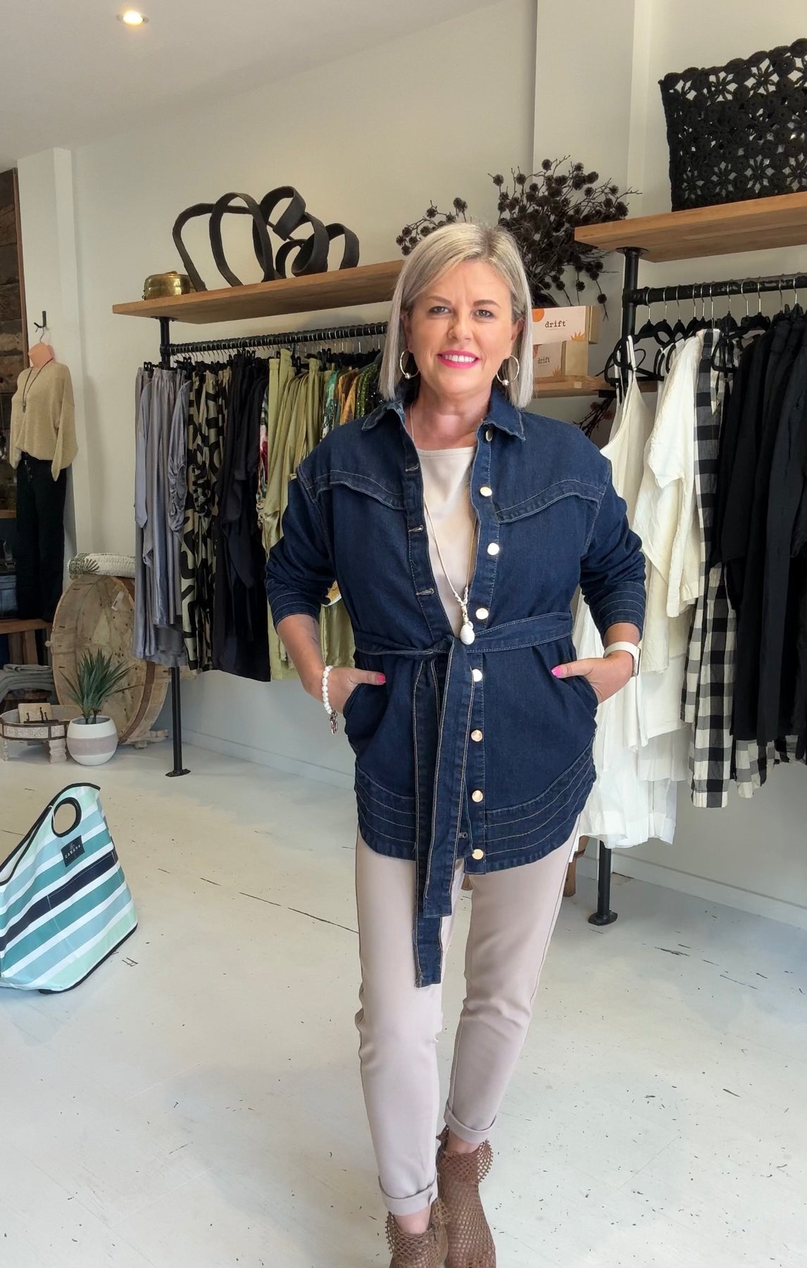 Kay is a size 10/12 and is wearing size S. She has styled the Tie Waist Denim Jacket with our Sweet Leisure Top and Jogger camel SM also with our Mahli necklace.