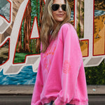 Vintage wash sweat in washed pink with subtle  soft orange Howdy print on the front. Soft 100% Washed Cotton fleece. Our standard oversized boyfriend fit.