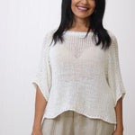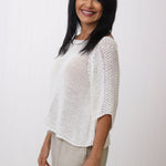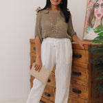 Drina is a size 8 and has styled the Violet Cotton Knit with our Kinsley Linen Pants.