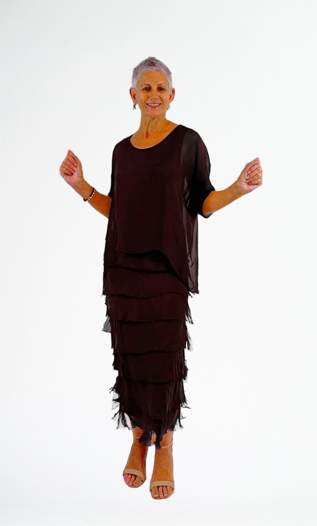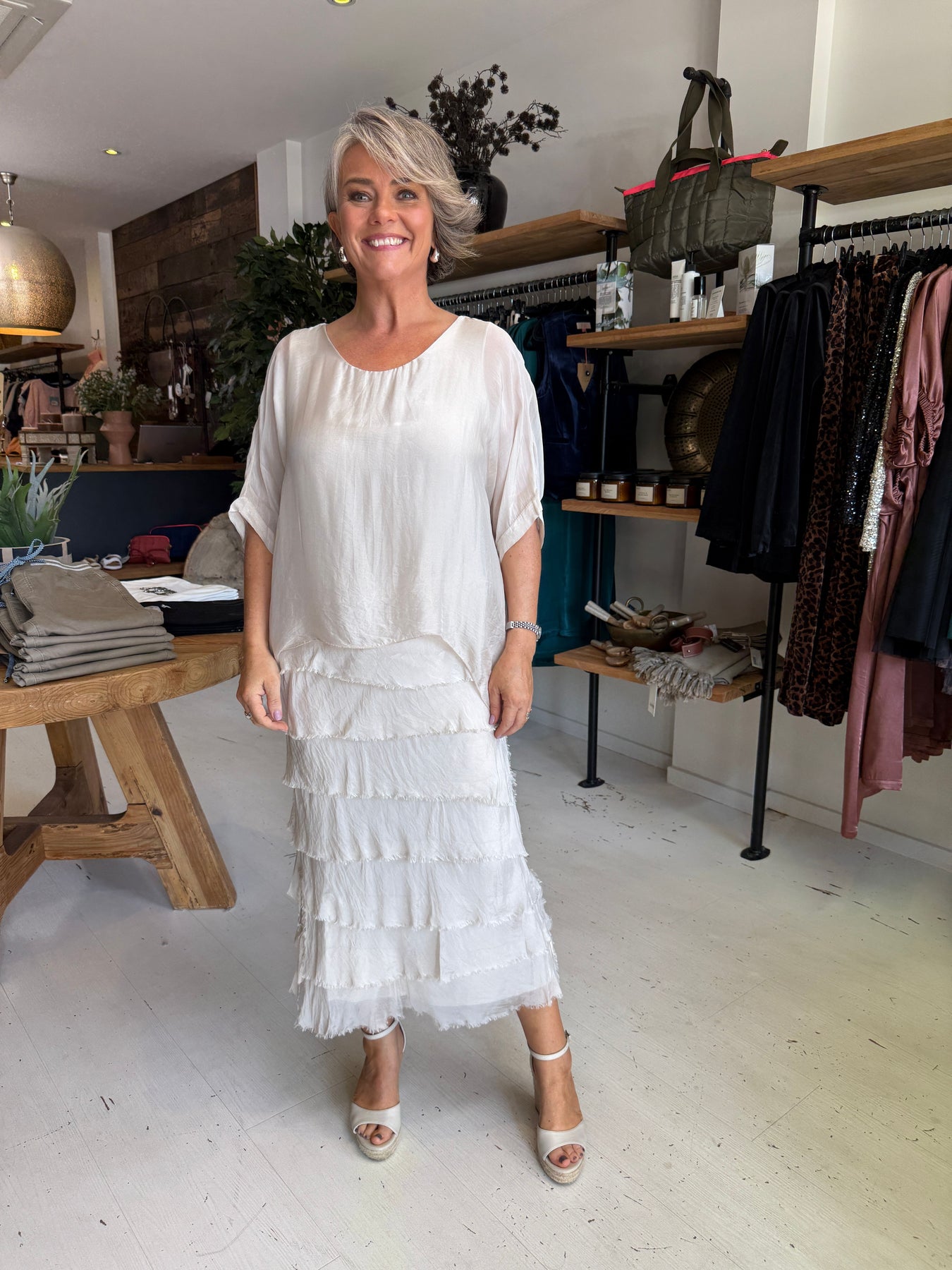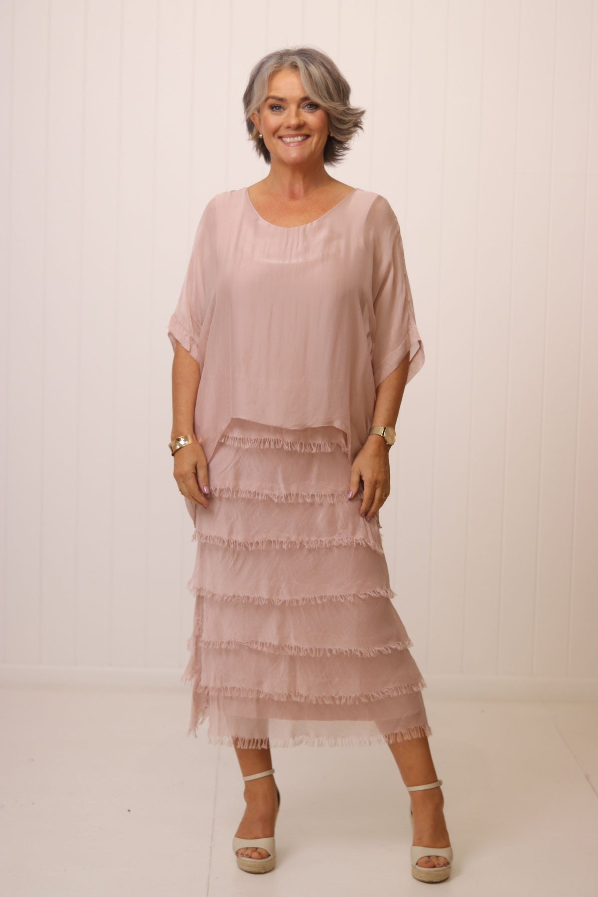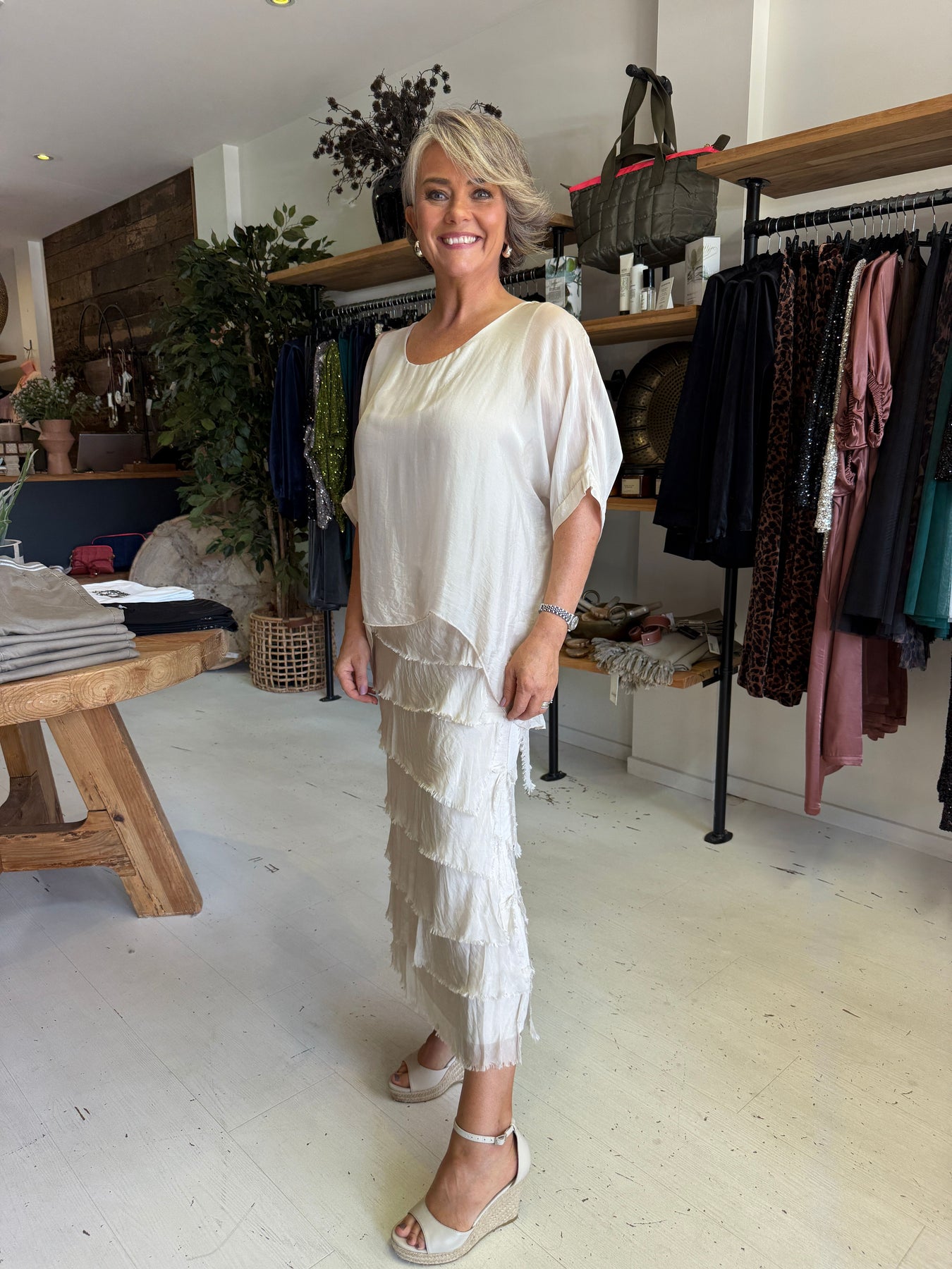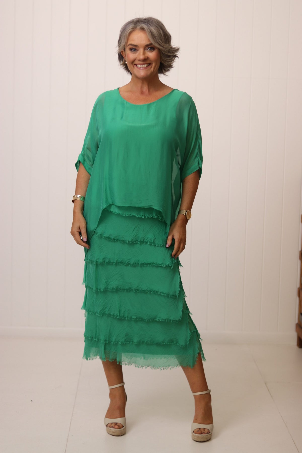 The Wendy Dress boasts a luxurious 30% silk and 70% viscose outer fabric, with a stretchy and comfortable 95% viscose and 5% elastane inner lining. Made in Italy, this dress features a round neckline, sheer short sleeves, and a tiered, flowy sheer silk overlay. With a maxi length and singlet shape, this dress is both stylish and comfortable. A gorgeous dress for a special occasion.