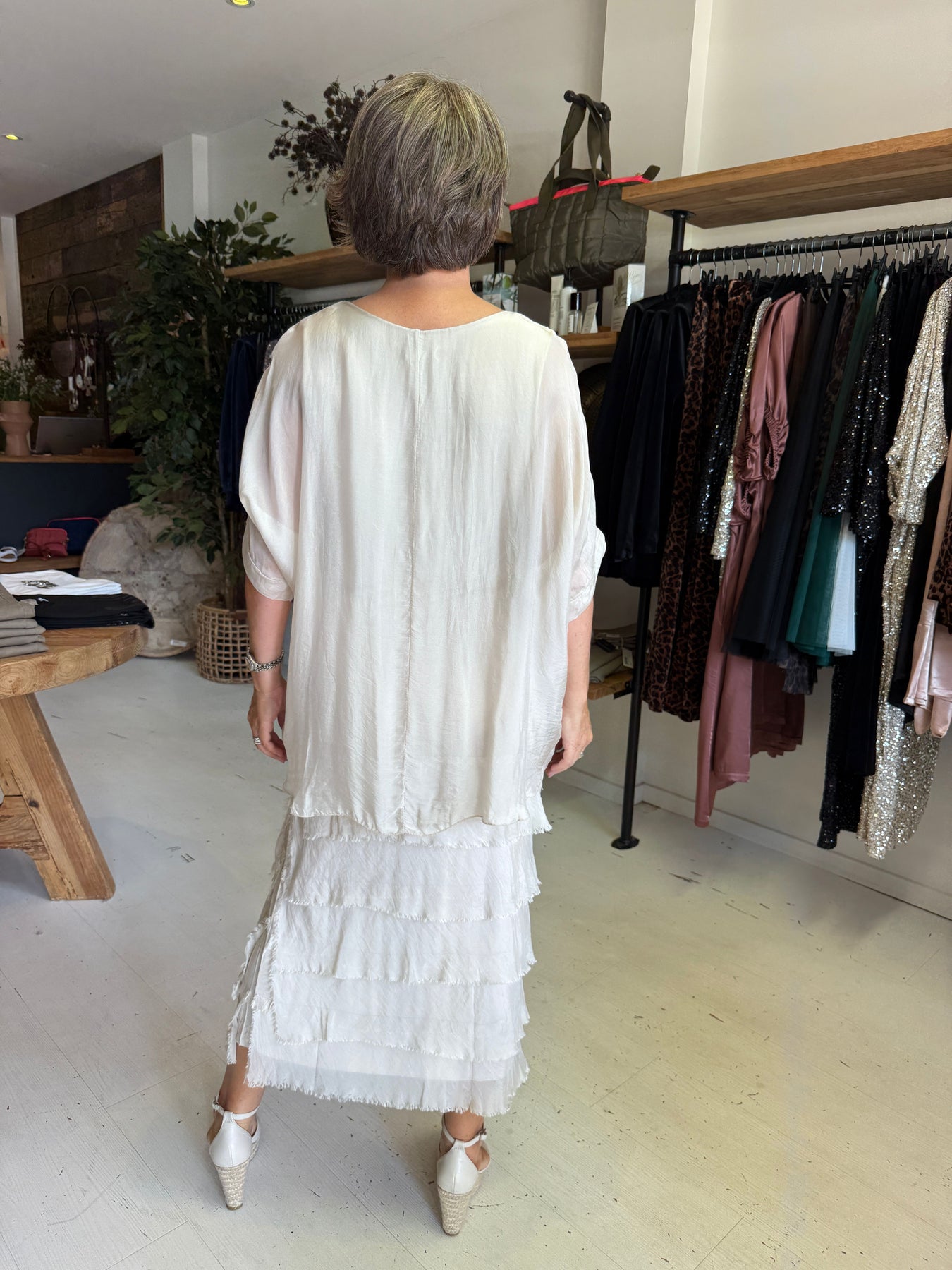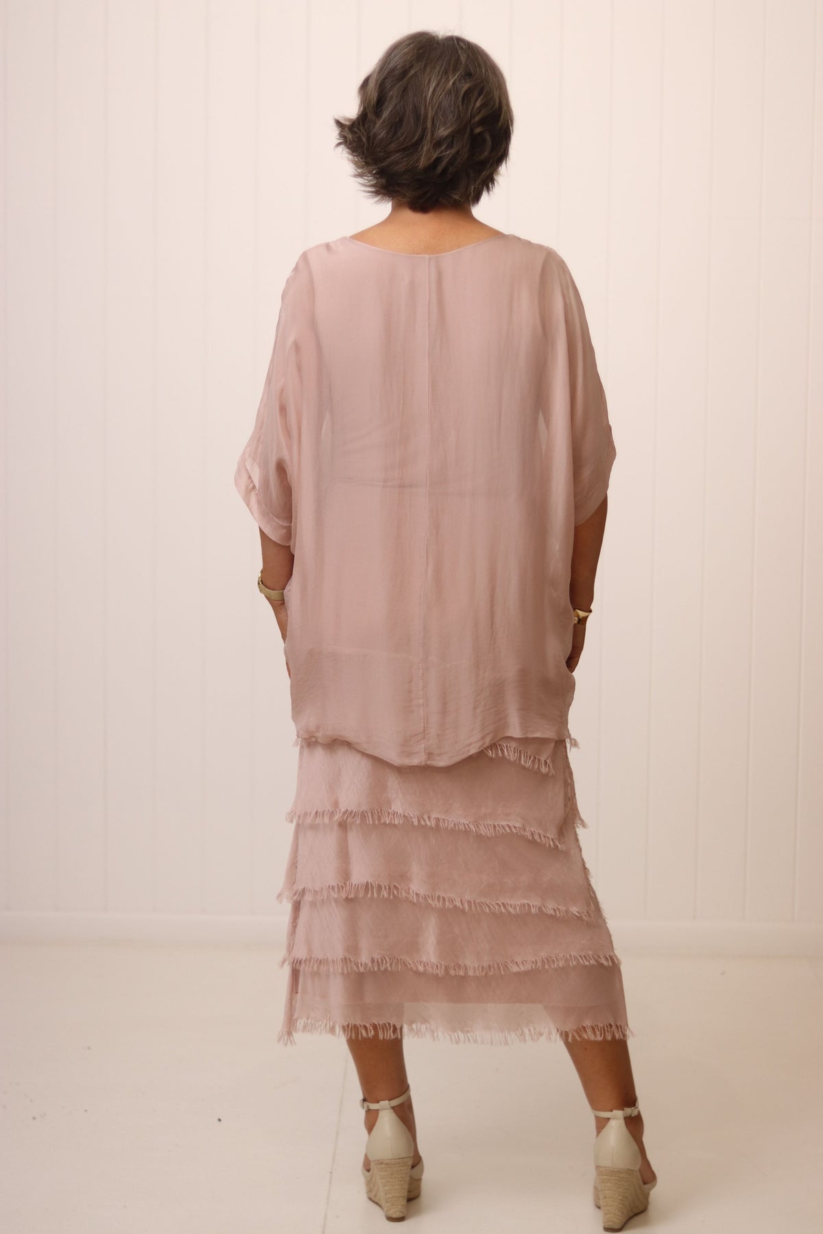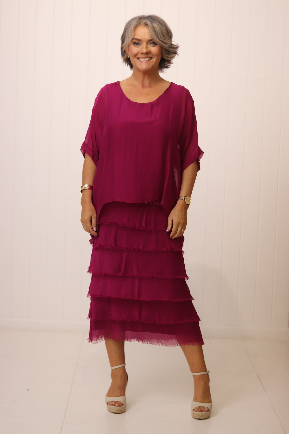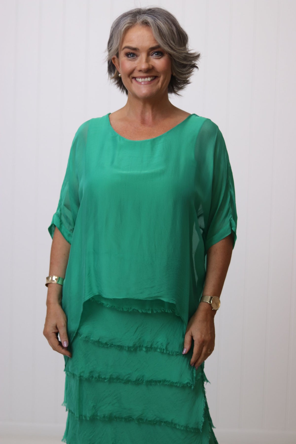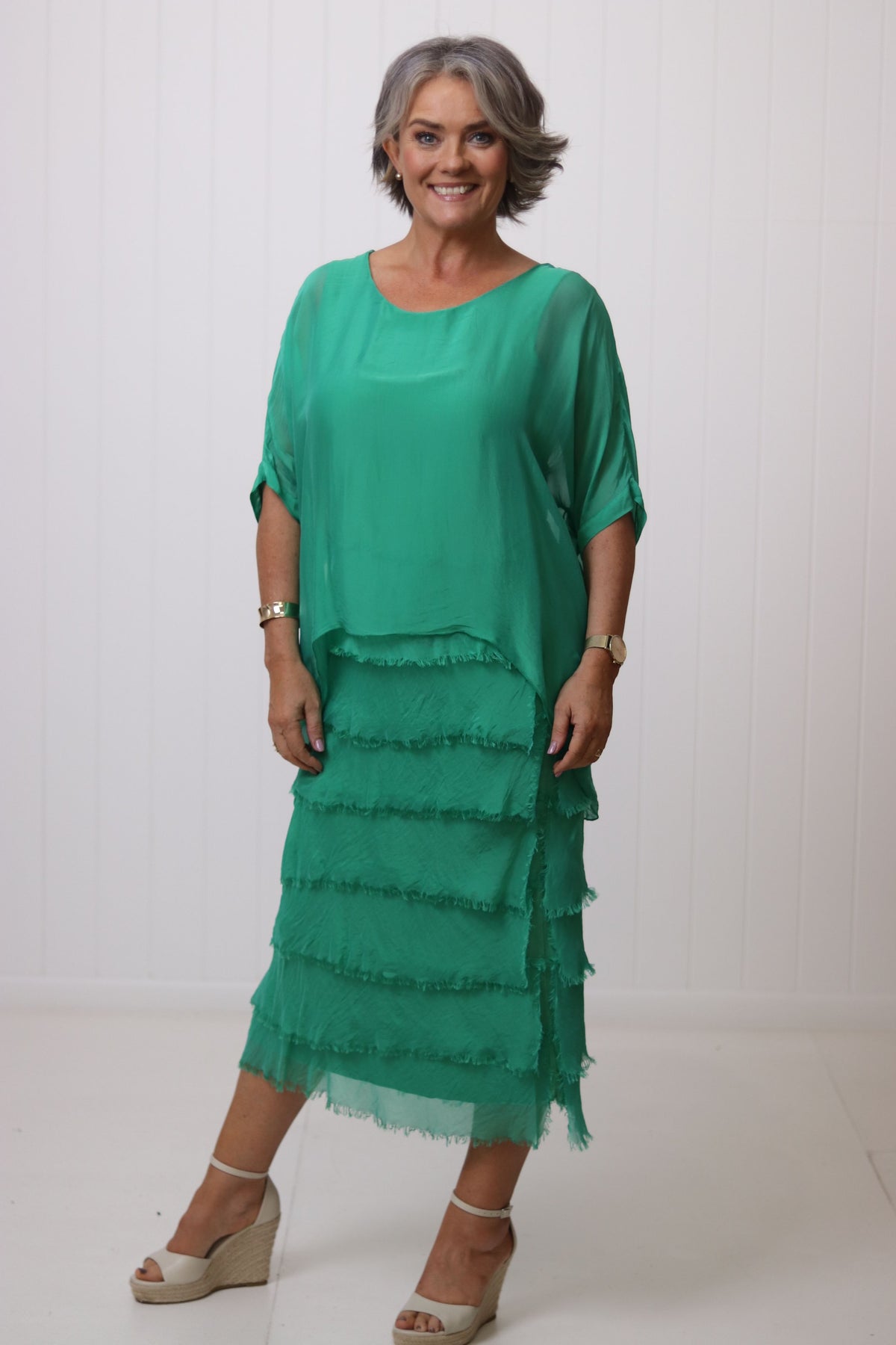 The Wendy Dress boasts a luxurious 30% silk and 70% viscose outer fabric, with a stretchy and comfortable 95% viscose and 5% elastane inner lining. Made in Italy, this dress features a round neckline, sheer short sleeves, and a tiered, flowy sheer silk overlay. With a maxi length and singlet shape, this dress is both stylish and comfortable. A gorgeous dress for a special occasion.